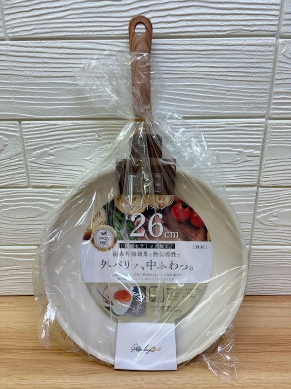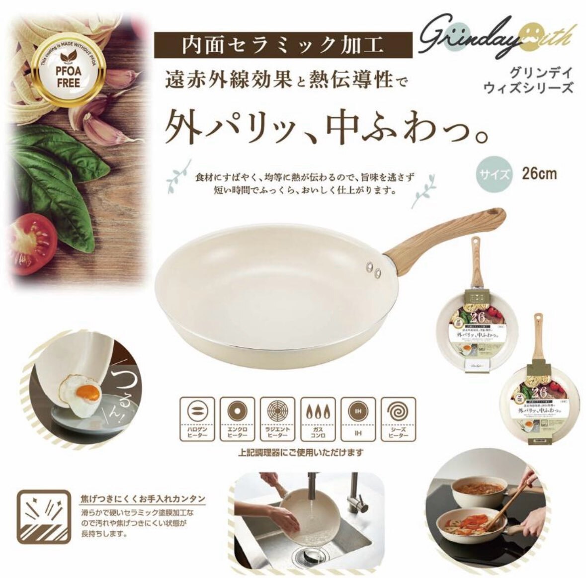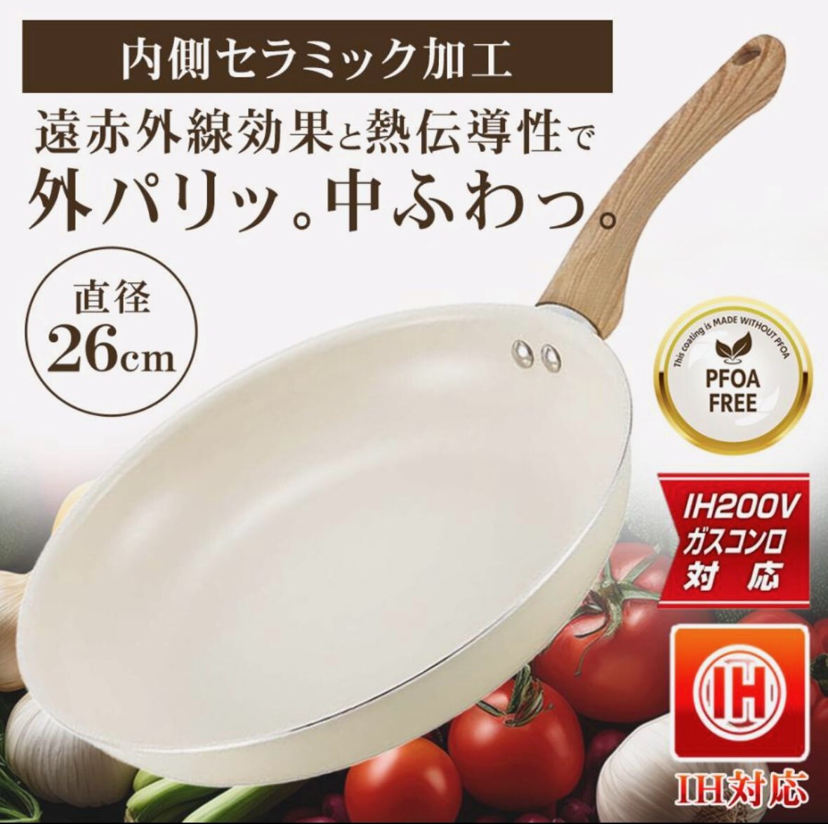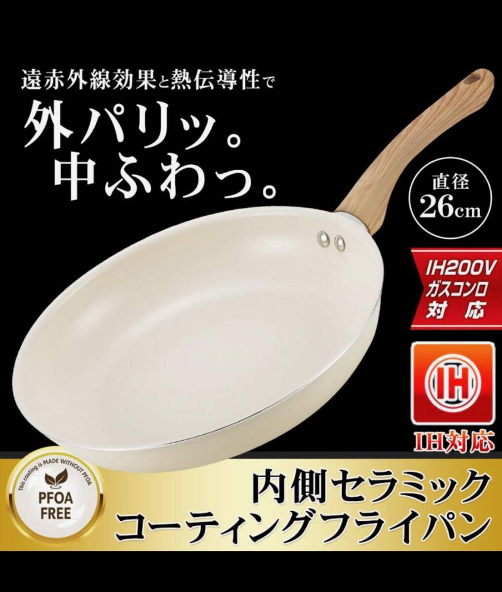 フライパン セラミックフライパン 26cm IH対応 遠赤外線 驚くほど焦げ付かないih ガス火 すべ〜る お手入れ簡単 軽い 炒め鍋 丈夫 /80S◇ セラミックフライパン熱の伝わりが早いセラミックコーティング。焦げ付きにくく、汚れもスルっと落ちてお手入れ簡単♪セラミックコーティングで遠赤外線効果!しっかり熱が通って、お料理も美味しく熱まわりが早いのでガス代・電気代が節約できて省エネ効果に!持ちやすいアップハンドル。炒めるのも、焼き物を裏返すのもカンタン。焦げ付きにくいセラミックコーティング加工。汚れもスルっと落ちます。いろんな料理に丁度いいサイズの26cm径。ガスコンロ、IHヒーターなどに対応。毎日の調理が楽しくなるIH対応のセラミックフライパン内面のセラミック加工により、遠赤外線効果で食材に素早く熱が伝わり、外はカリッと、中はふわっとした仕上がりに26cmサイズで、炒め物や焼き物に便利軽量設計で扱いやすく、ガスコンロにも対応。熱伝導の良さが時短調理にも役立ち、忙しい日々の料理をサポートおしゃれなウォームアイボリーカラーで、キッチンに温かみをプラス。サイズ:約445×276×82mmIH対応(100V・200V)、ガスコンロ対応重量:約600g内面:セラミック塗膜加工、外面:焼付塗装取手/フェノール樹脂(木目調転写)