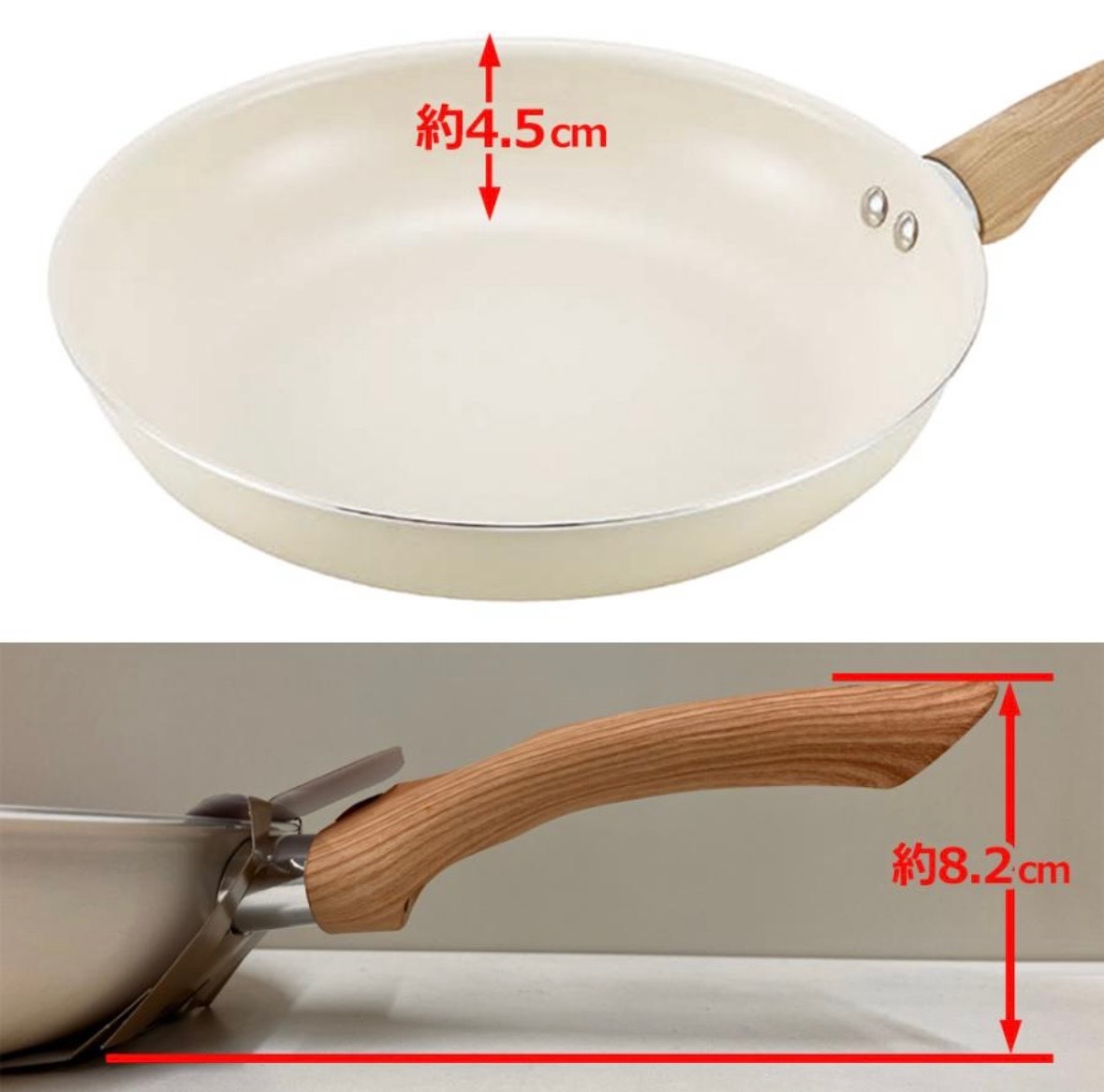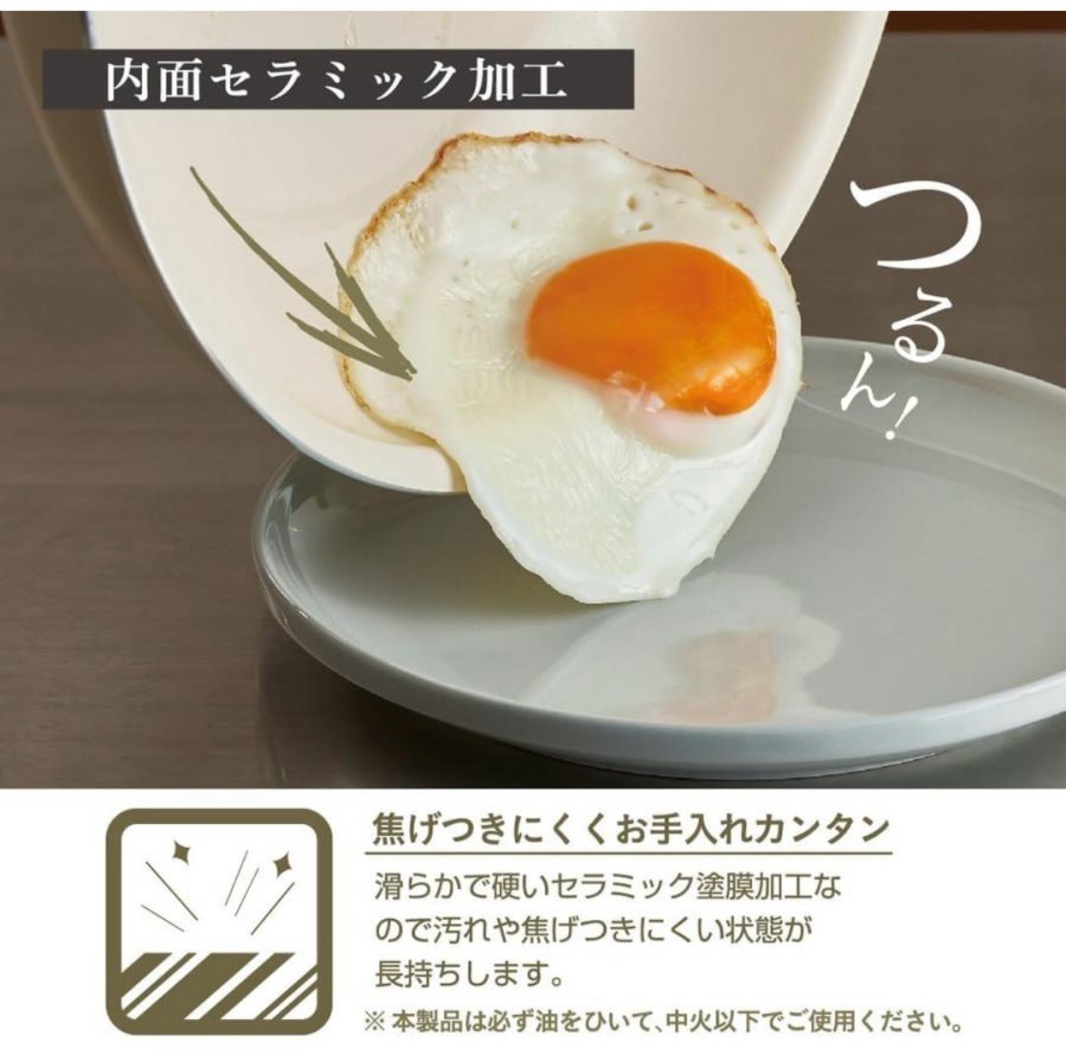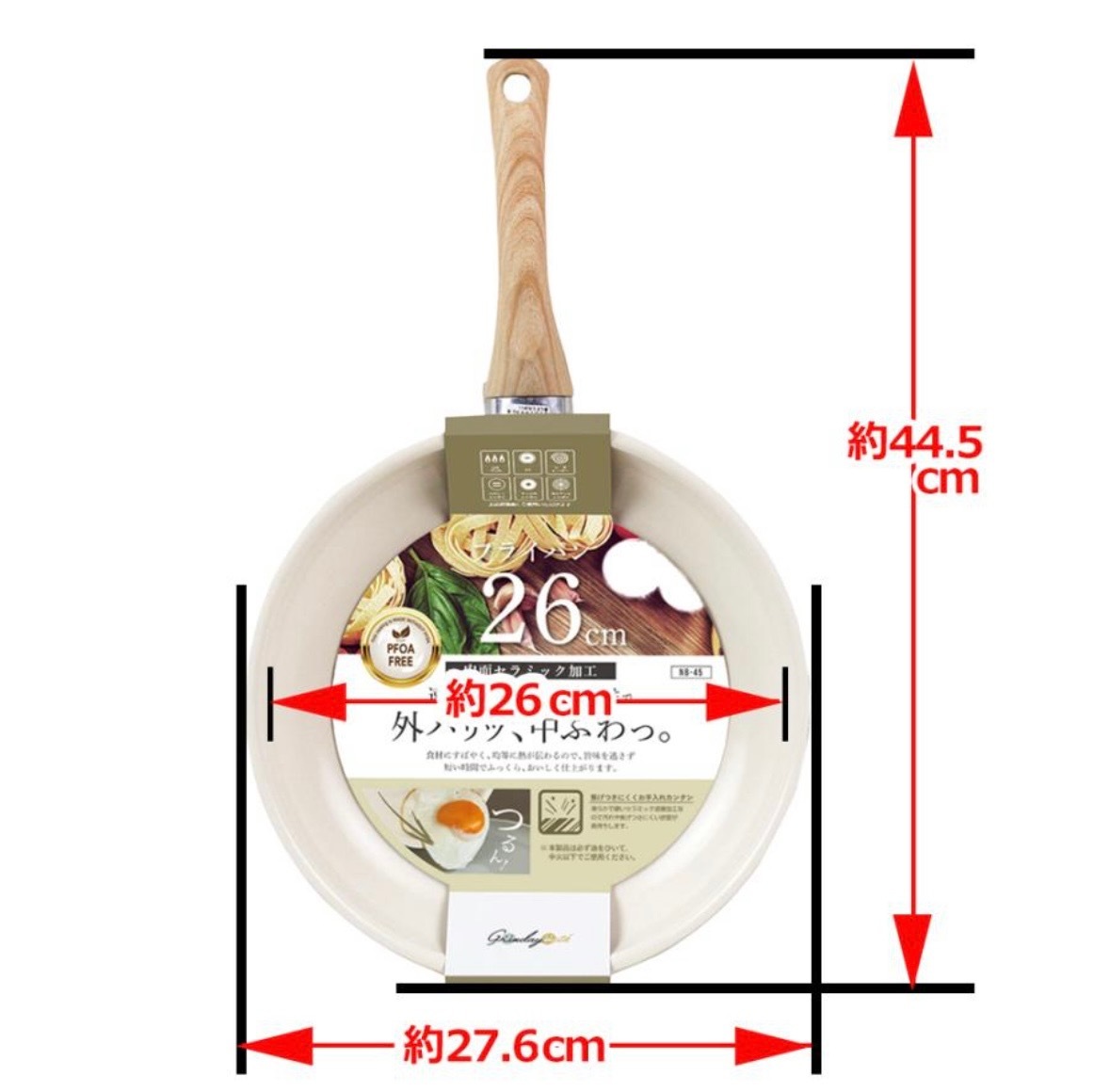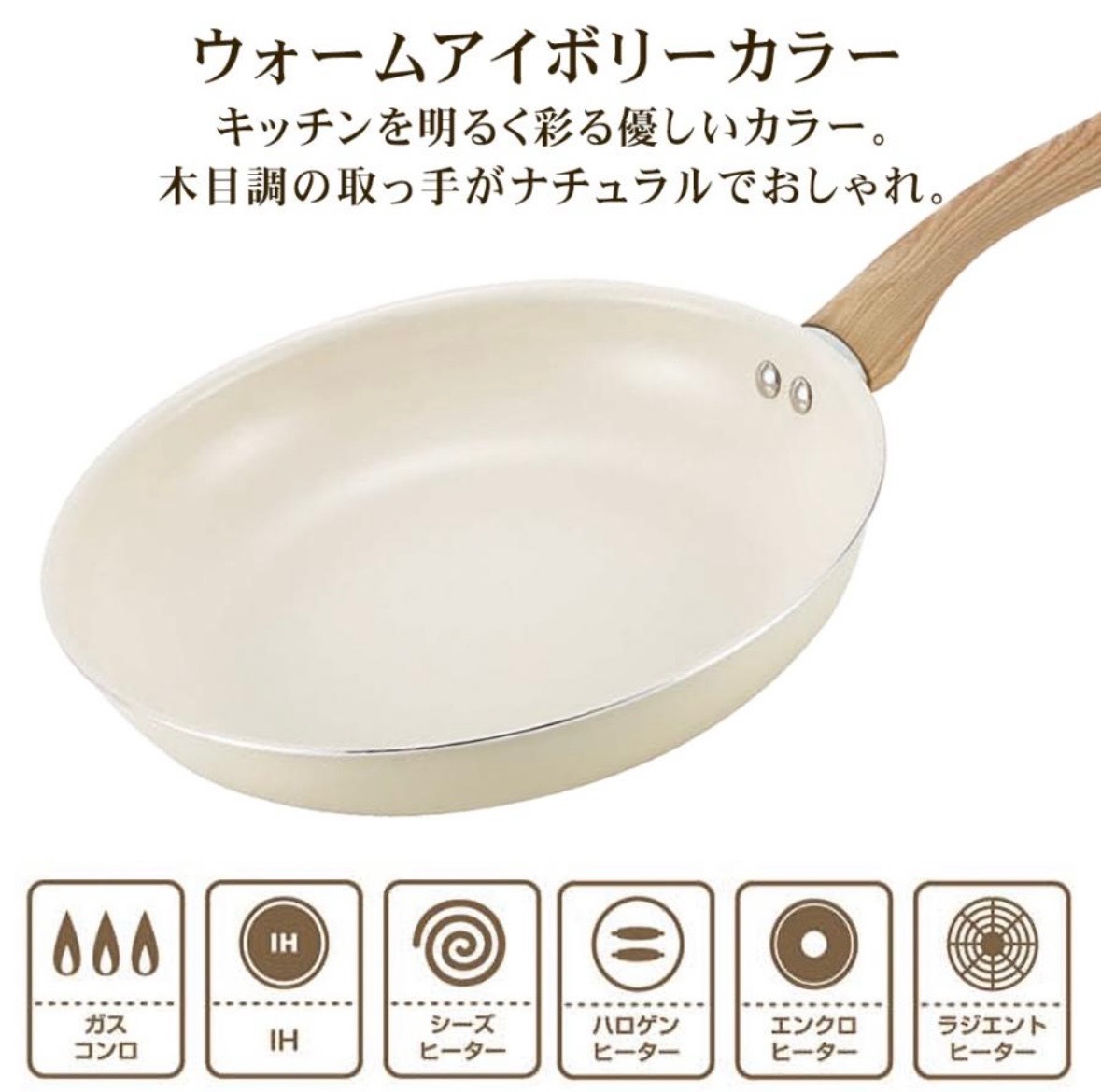 フライパン セラミックフライパン 26cm IH対応 遠赤外線 驚くほど焦げ付かないih ガス火 すべ〜る お手入れ簡単 軽い 炒め鍋 丈夫 /80S◇ セラミックフライパン熱の伝わりが早いセラミックコーティング。焦げ付きにくく、汚れもスルっと落ちてお手入れ簡単♪セラミックコーティングで遠赤外線効果!しっかり熱が通って、お料理も美味しく熱まわりが早いのでガス代・電気代が節約できて省エネ効果に!持ちやすいアップハンドル。炒めるのも、焼き物を裏返すのもカンタン。焦げ付きにくいセラミックコーティング加工。汚れもスルっと落ちます。いろんな料理に丁度いいサイズの26cm径。ガスコンロ、IHヒーターなどに対応。毎日の調理が楽しくなるIH対応のセラミックフライパン内面のセラミック加工により、遠赤外線効果で食材に素早く熱が伝わり、外はカリッと、中はふわっとした仕上がりに26cmサイズで、炒め物や焼き物に便利軽量設計で扱いやすく、ガスコンロにも対応。熱伝導の良さが時短調理にも役立ち、忙しい日々の料理をサポートおしゃれなウォームアイボリーカラーで、キッチンに温かみをプラス。サイズ:約445×276×82mmIH対応(100V・200V)、ガスコンロ対応重量:約600g内面:セラミック塗膜加工、外面:焼付塗装取手/フェノール樹脂(木目調転写)