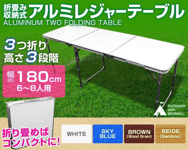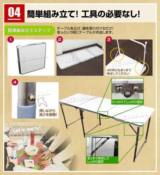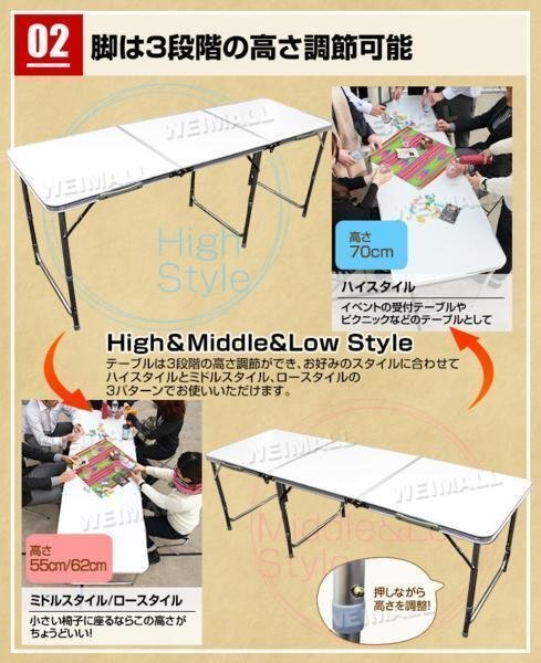 車のトランクに入れる時や持ち運びの際にもとても便利な取っ手付きで持ち運びもラクラク!! サビに強いアルミを使用。 天板には防水加工が施されています。 テーブルは3段階の高さ調節ができ、お好みのスタイルに合わせて「ハイスタイル」「ロースタイル」の2パターンでお使いいただけます。 キャンプ、バーベキュー、お花見などにとても便利。 気軽にアウトドアレジャーをお楽しみいただけます!! 【商品仕様】 折りたたみ式 テーブルサイズ(約):幅180cm×奥行60cm×高さ55cm/62cm/70cm ※高さ3段階調節 カラー:ブラウン 収納サイズ(約):幅62cm×奥行10cm×高さ62cm 耐荷重(約):20kg 重量(約):7.2kg 材質:アルミ、MDF(耐熱・耐水加工)、ポリエステル、スチール 【注意事項】 ・海外製品で、簡易梱包での輸入のため風防に擦れや多少の小キズなどがある場合がございますが、商品自体には問題ありませんのでご了承下さい。 ・商品は、モニターによって色合いが異なって見える場合があります。 ・仕様・デザインは改良のため予告なく変更することがあります。 【その他ラインナップ】 ・70cm ・90cm(ベンチ付き) ・90cm(4色選択・ベンチなし) ・120cm(イス付き) ・120cm(4色選択・イスなし) ・135cm(BBQタイプ) ・180cm(4色選択・イスなし) ・240cm(4色選択・イスなし) |