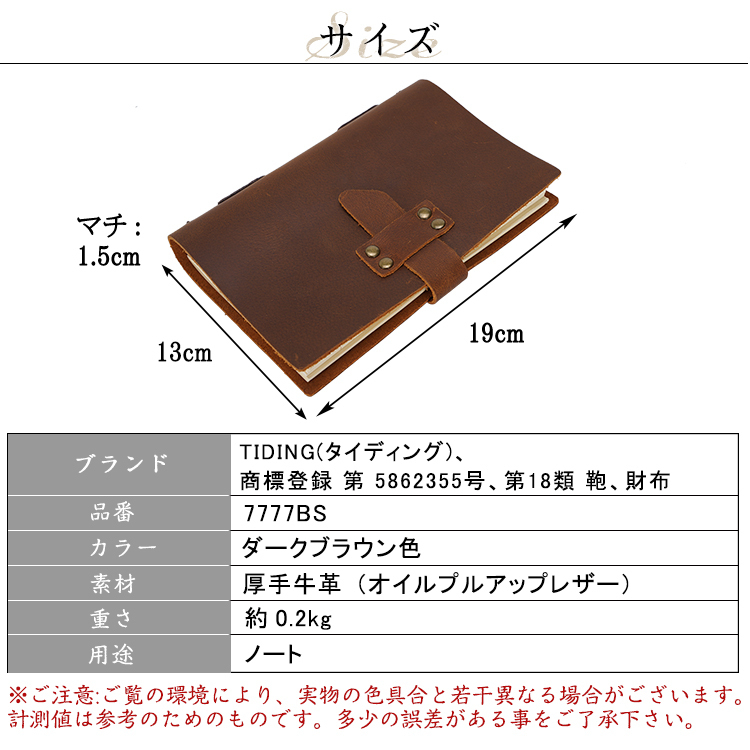 TIDING 手作り A5サイズ 本革 手帳 ノート 厚手牛革 オイルブルアップレザー 経年変化 ダークブラウン 潮牛