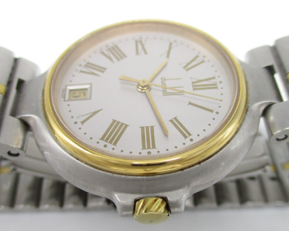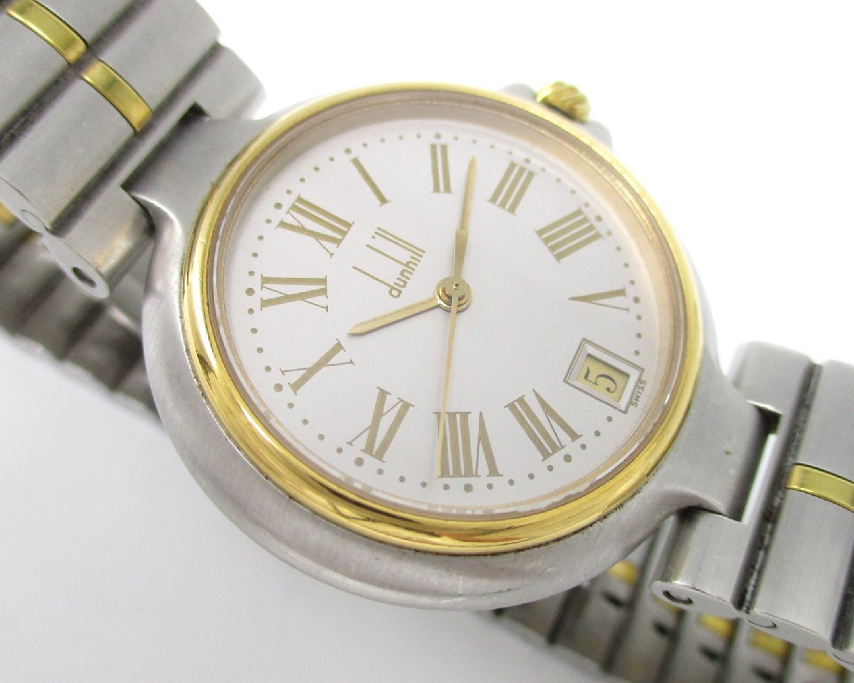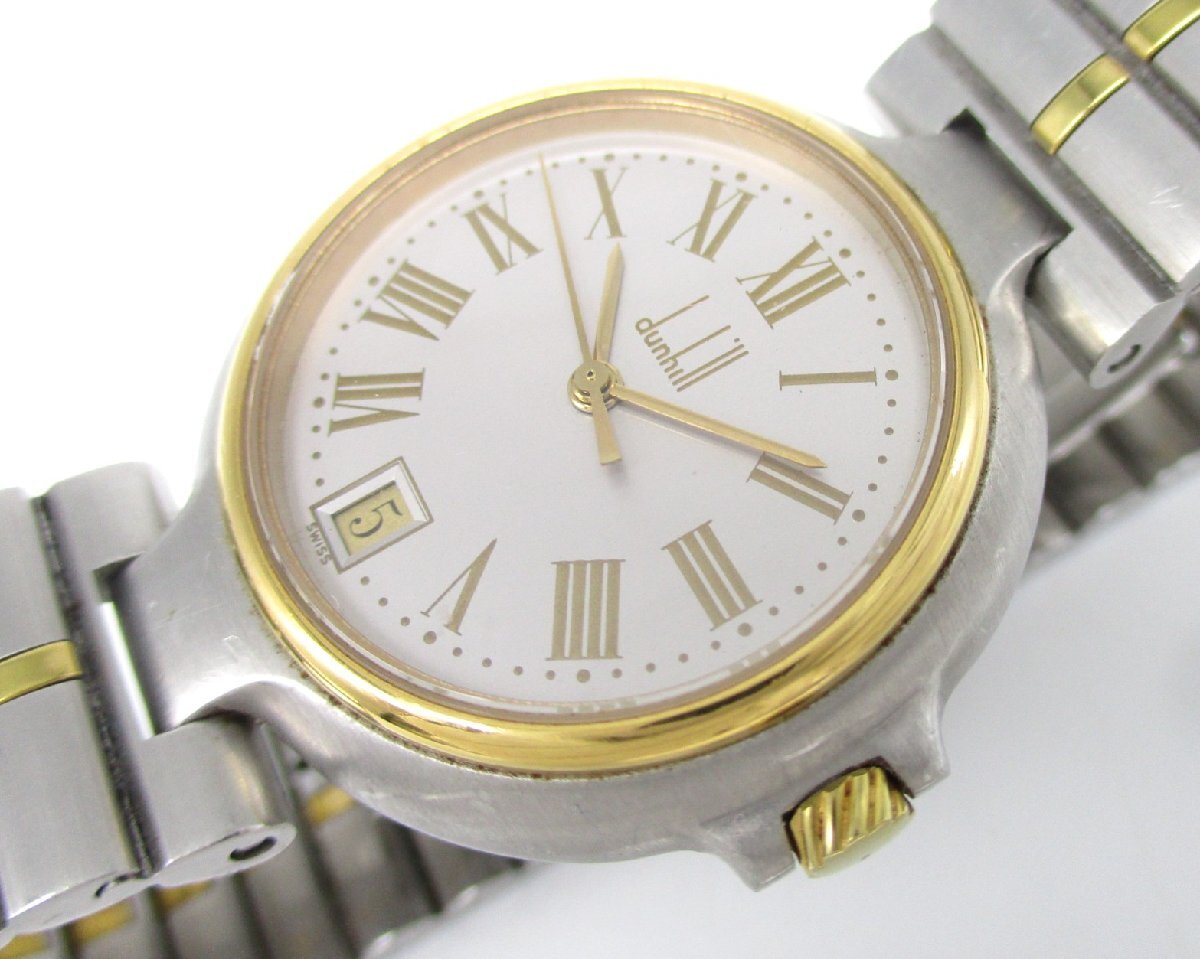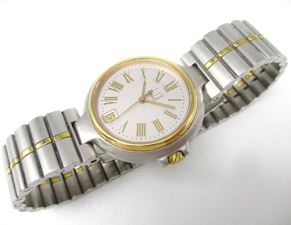 | dunhill ダンヒル ミレニアム クォーツ ブレスが観音開きになる、後期タイプです。 【およそのサイズ】ケース径:32mm 腕回り:19cm 【状態】ガラスは無傷です。文字盤に汚れは見られません。ケース、ブレスは小傷、スレ程度で美品レベルだと思います。 クォーツ時計の入っている電池はモニター電池扱いでお願いいたします。発送までに止まった場合は電池交換後、発送いたしますが、その後の電池切れの際は、落札者様御自身でメーカーもしくは一般店に電池交換にお出しください。 【付属品】箱・保証書等は無く、時計のみです。 | ||||