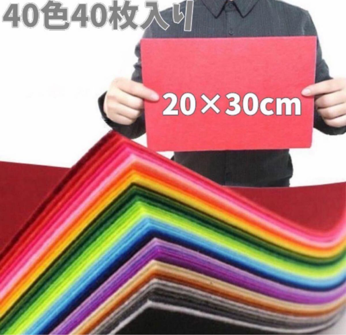 定番カラーが揃った20×30cmのフェルト生地40枚セット♪ 扱いやすく加工しやすい厚さ1mmの大きさです。お子様への手作りおもちゃ、ワッペン、アップリケなどなど
