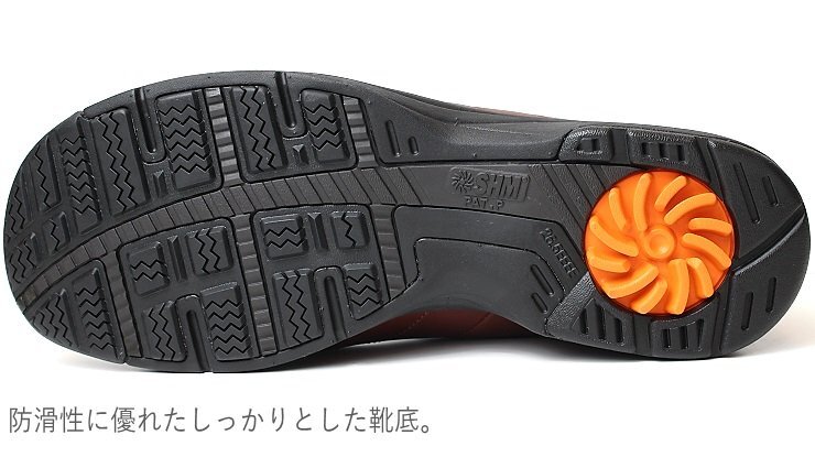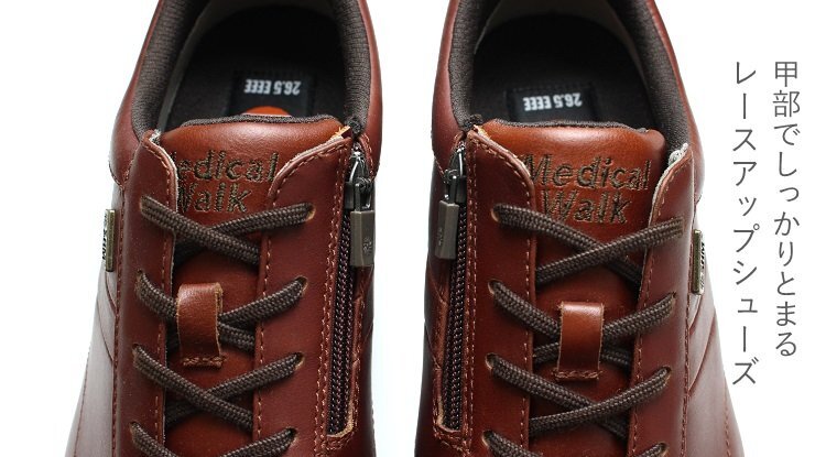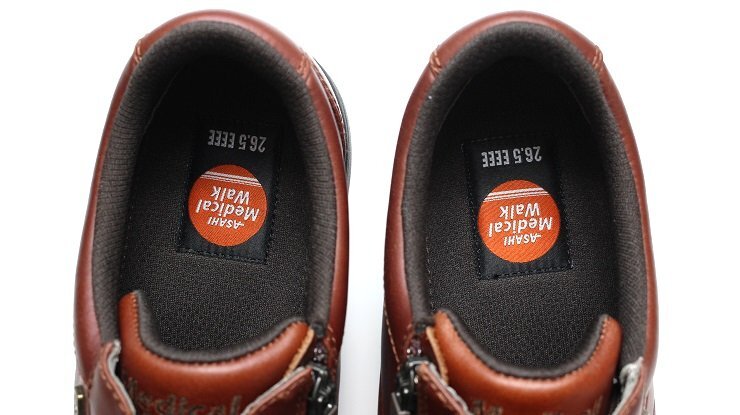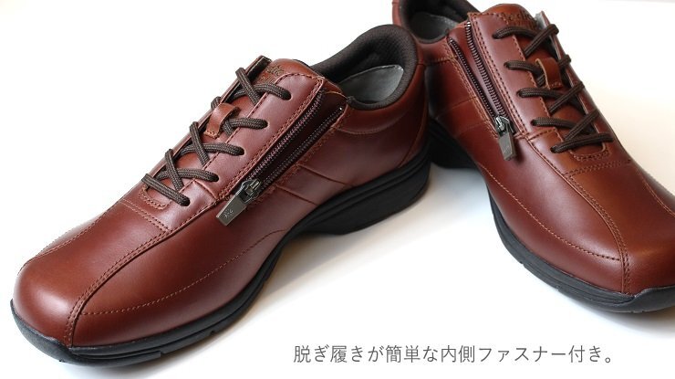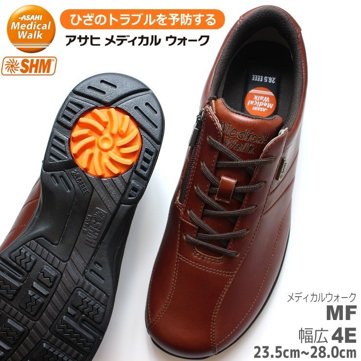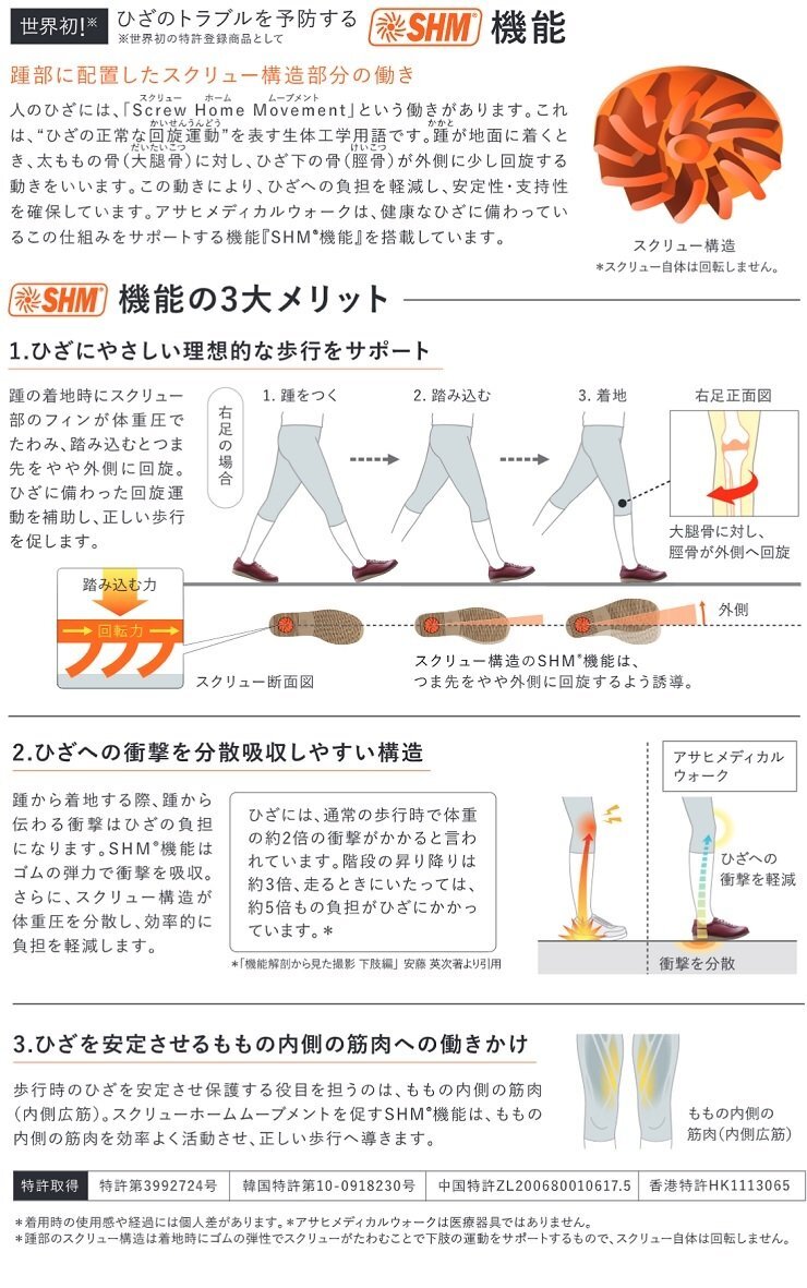 | ひざへの底力 世界初、ひざのトラブルを予防する【SHM機能】搭載。 アサヒ メディカルウォーク 足にやさしくフィットする、好評のロングセラーモデル。 男性向け。 アッパー素材表面に水を弾く、撥水加工つき。 散歩、立ち仕事、普段のお出かけでも使える万能アイテムです。 ファスナーで脱ぎ履きが楽ちん! 機能説明 ・SHM機能の3大メリット 1.ひざ関節を守る理想的な歩行をサポート 踵の着地時にスクリュー部のフィンが体重圧でたわみ、踏み込むとつま先をやや外側に回旋。 ひざに備わった回旋運動を補助し、正しい歩行を促します。 2.ひざへの衝撃を分散吸収しやすい構造 踵から着地する際、踵から伝わる衝撃はひざの負担になります。 SHM機能はゴムの弾力で衝撃を吸収。 さらに、スクリュー構造が体重圧を分散し、効率的に負担を軽減します。 3.ひざを安定させる ももの内側の筋肉への働きかけ 歩行時のひざを安定させ保護する役目を担うのは、ももの内側の筋肉(内側広筋)。 スクリューホームムーブメントを促すSHM機能は、 ももの内側の筋肉を効率よく活動させ、正しい歩行へ導きます。 ・内側にファスナー付き。 ・アウトソールの特殊配合ラバーは、従来のラバーにカーボンを特殊配合し 粘性を高め、グリップ力の向上を図りました。 ・アッパー素材表面に水を弾く、撥水加工つき。 ・足の裏にかかる足圧を最適に各部位へ誘導し、へたりにくく ソフトな使用感の「フットグラファーインソール」採用。 ・メーカー独自の足型測定器『フットグラファー』により、全国で測定された データを基に作られた快適設計の足型を採用。 足囲:4E ヒール外寸:約35mm | |