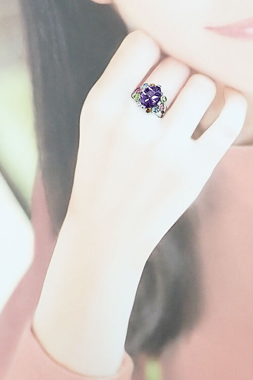 コメントタサキの、みずみずしい艶感のアメジストを取り囲むように色とりどりの宝石があしらわれた、可愛らしい雰囲気のリングです。高低差のあるセッティングで、立体感と軽やかさを感じさせるファッショナブルな一品です。