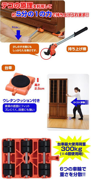 | 内 容 | ■ドーリー 軽がるキャリー ■品番 KGC-C6 ■台車最大使用荷重 300kg(※4個使用時) ●家具を軽々持ち上げて楽ちん移動可能です。 ●テコの原理を利用して約5分の1の力で持ち上げられます。 ●ウレタンクッション付きでズレにくいです。 ※パッケージに傷みあります |