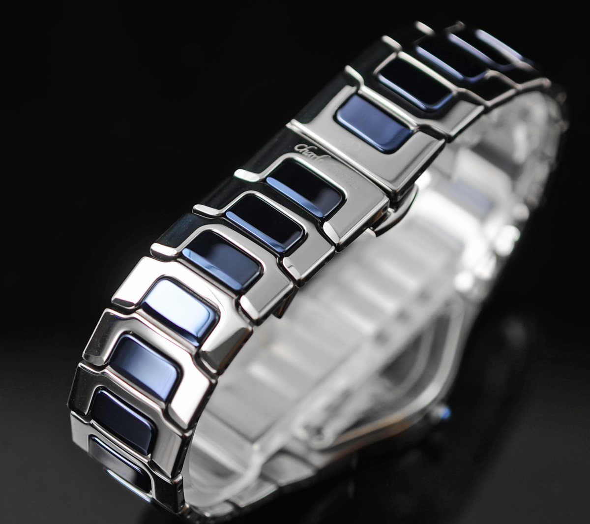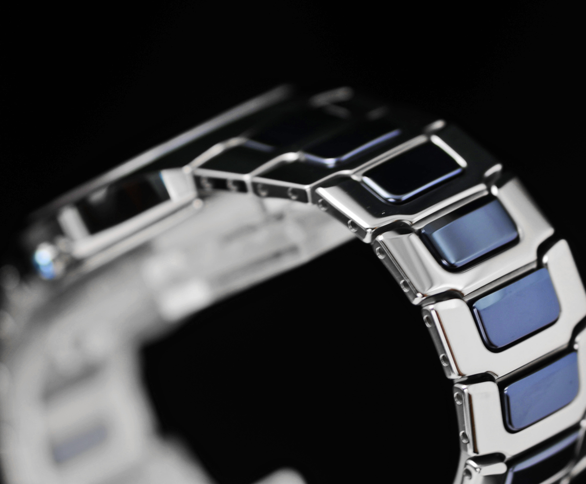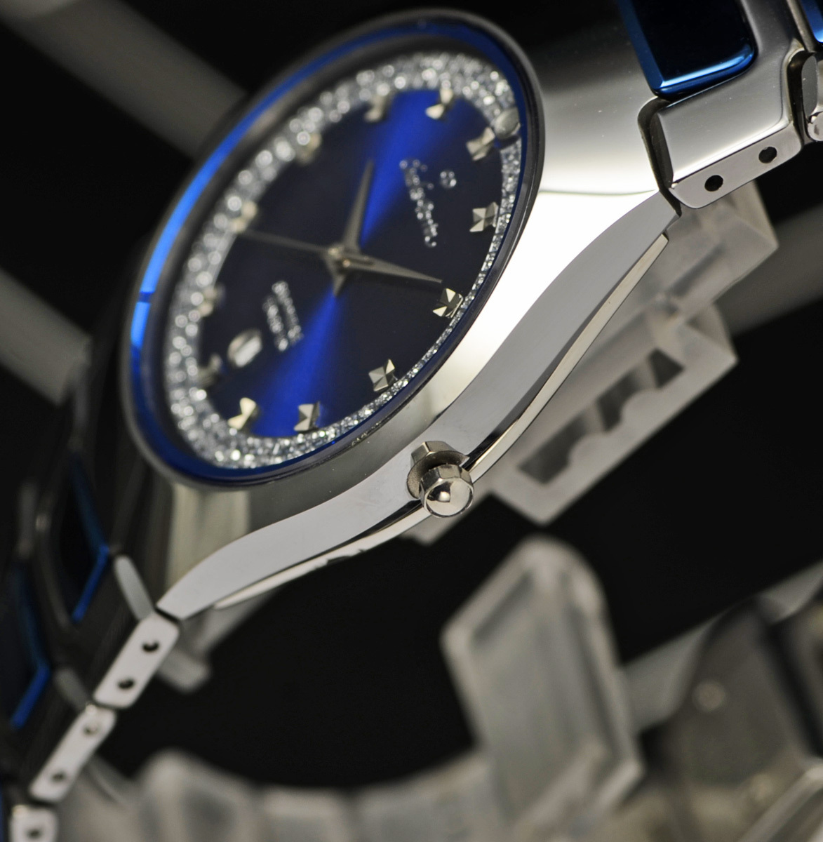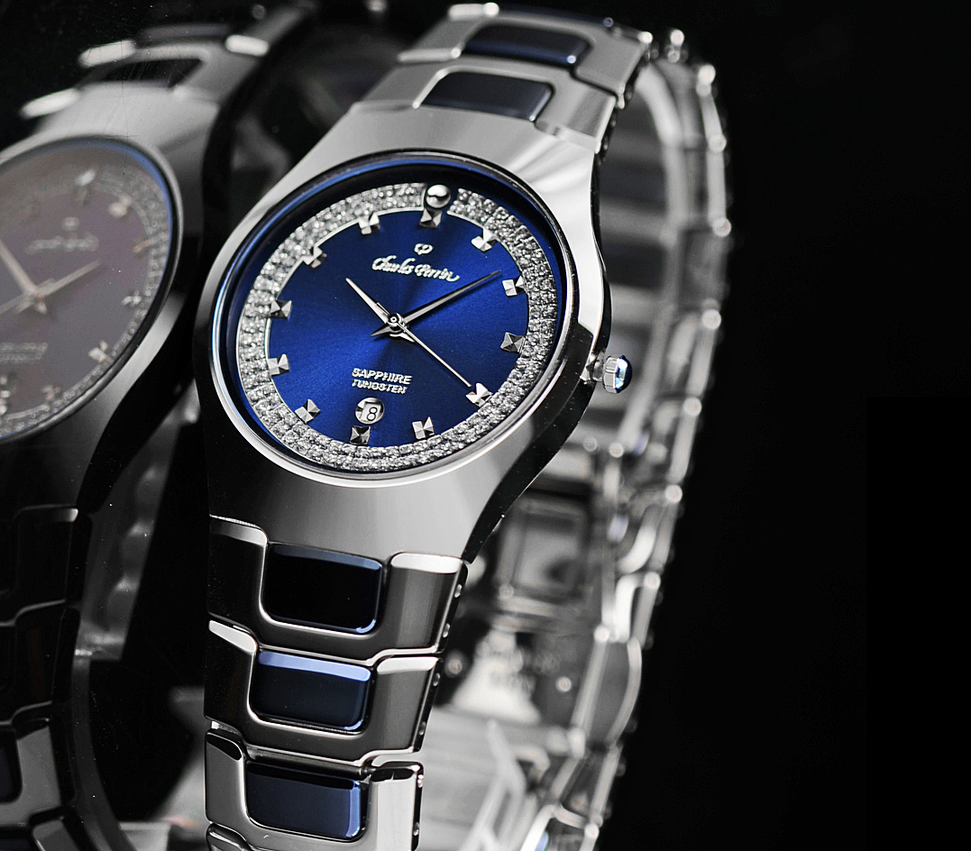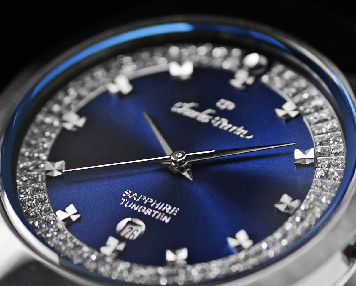 今回の品は、ケースにタングステン、ベルトのカラー部分にセラミックを採用し、風防にはサファイヤクリスタル、文字盤にCZダイヤを散りばめた豪華なスタイリッシュウォッチ。