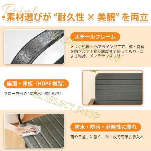 • 【素材選びが “耐久性 × 美観” を両立】・スチールフレーム:メッキ処理 + ヘアライン加工で、傷・腐食を防ぎます!長期間屋外で使ってもカッコよさ維持、メンテナンスフリー・座面・背板(HDPE 樹脂):ブロー成形で “本格木目調” 再現!防水・防汚・耐候性に優れ、雨や日差しに強く、布 1 枚で簡単お手入れ