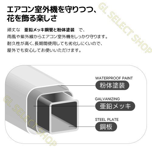 ◎02エアコン室外機を守りつつ、花を飾る楽しさ 頑丈な亜鉛メッキ鋼管と粉体塗装で、雨風や紫外線からエアコン室外機をしっかり守ります。耐久性が高く、長期間使用しても劣化しにくいので、屋外でも安心してお使いいただけます。上部のラック部分は、鉢植えやプランターを置くのに最適なスペースを提供し、エアコン周りを華やかに彩ります。ベランダやお庭にグリーンを増やして、おしゃれでリラックスできる空間を作りましょう。棚板サイズ:上段 約幅85*奥行24cm 下段 約幅85*奥行34cm 耐荷重:30KG ラックには転倒防止用の金具が付いており、安心して使用できます。転倒防止対策:壁に取り付けるラックを壁にしっかりと取り付けることで、転倒のリスクを大幅に減らします。使用環境や必要に応じて、膨張管とネジを使用して強固に固定できます。
