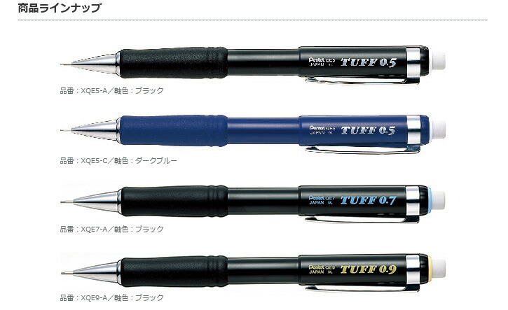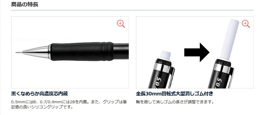 0.5mmにはB、0.7/0.9mmには2Bを内蔵。また、グリップは筆記感の良いシリコングリップです。