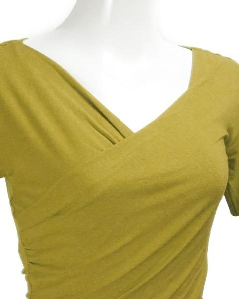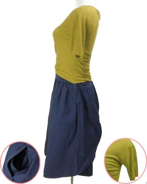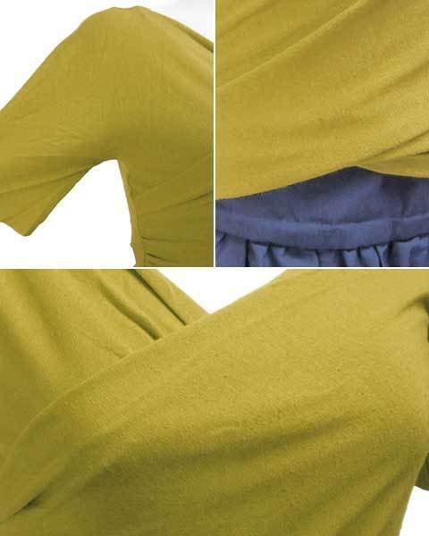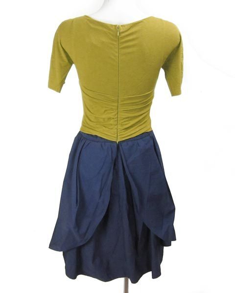 | コメント | 女性らしい上品なワンピース。 身頃部分はストレッチの効いた薄手素材、 スカート部分はややハリのあるコットン風素材。 スカートのフロント部分は2枚重ねになります。 フロントスタイル、バックスタイルとも素敵なデザインです。身頃のお色味はもう少し明るいグリーンです。 |