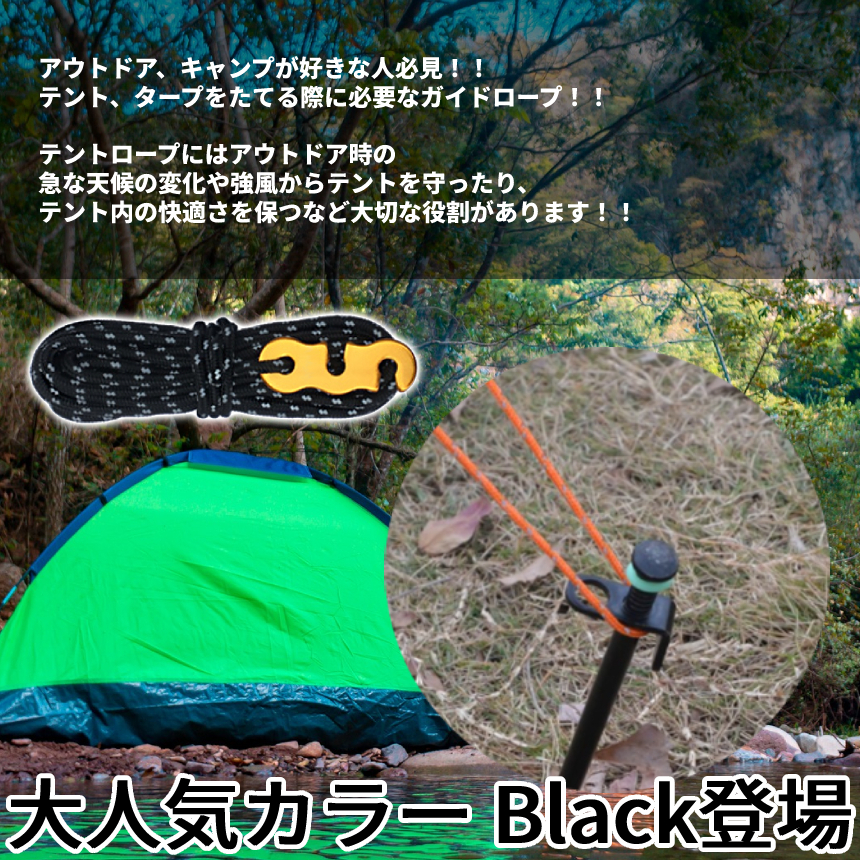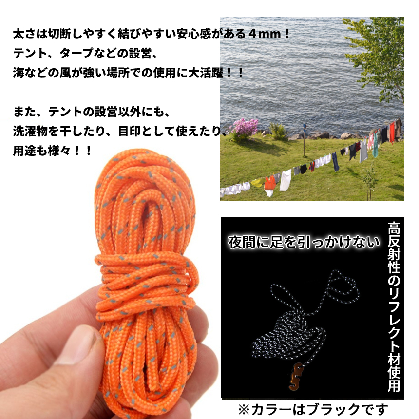 | 送料無料!!! 送料及び下記のご案内をご確認の上、ご入札お願い致します。 離島地域を除く九州、四国、本州まで送料無料。 ※北海道は+1000円、離島地域及び沖縄県は+3000円にて承ります。(発送前に加算) ※画像内にカラー及びサイズ等の選択が可能と記載がある場合がございますが、 お届けする物はタイトルまたは商品説明文に記載の物です。 ★※注文後のカラー変更や異なるカラー・サイズ指定等は一切承っておりません。 ※★※仕様(ロゴデザイン/ロゴ有無等も含む)は予告なく変更する場合があります。 ※多少の汚れや小傷がある場合がございますがご了承ください。 梱包は簡易包装ですので、箱の角落ち等はご了承願います。 【商品説明】 アウトドア、キャンプが好きな人必見!! テント、タープをたてる際に必要なガイドロープから待望の新色登場! 新色ブラックは 「テントやタープの雰囲気を壊さず、夜には反射材で視える」を実現! テントロープにはアウトドア時の 急な天候の変化や強風からテントを守ったり、 テント内の快適さを保つなど大切な役割があります!! 太さは切断しやすく結びやすい安心感がある4mm! テント、タープなどの設営、 海などの風が強い場所での使用に大活躍!! また、テントの設営以外にも、 洗濯物を干したり、目印として使えたり、 用途も様々!! ロープ自体に反射材の糸が入っているので、 夜間にキャンプをしても、 暗闇や光が少ない場所でも 反射材が光るので、 ロープの場所がわかりやすい!! 暗い場所ではロープに足を引っ掛けて転倒するなど、 思わぬケガをしてしまいます。 この反射材入りのロープなら、 安全にキャンプを楽しめることができます!! ======================================== 【商品仕様】 カラー:Blackブラック 長さ:約4m 太さ:約4mm 素材:ナイロン(ポリプロピレン+反射材入り糸 ) 内容:ロープ×4本、アルミニウム製自在金具×4個 ※ペグは付属しておりません ======================================== ※詳細は画像にてご確認ください ![]() ![]() ![]() ![]() ![]() ![]() |