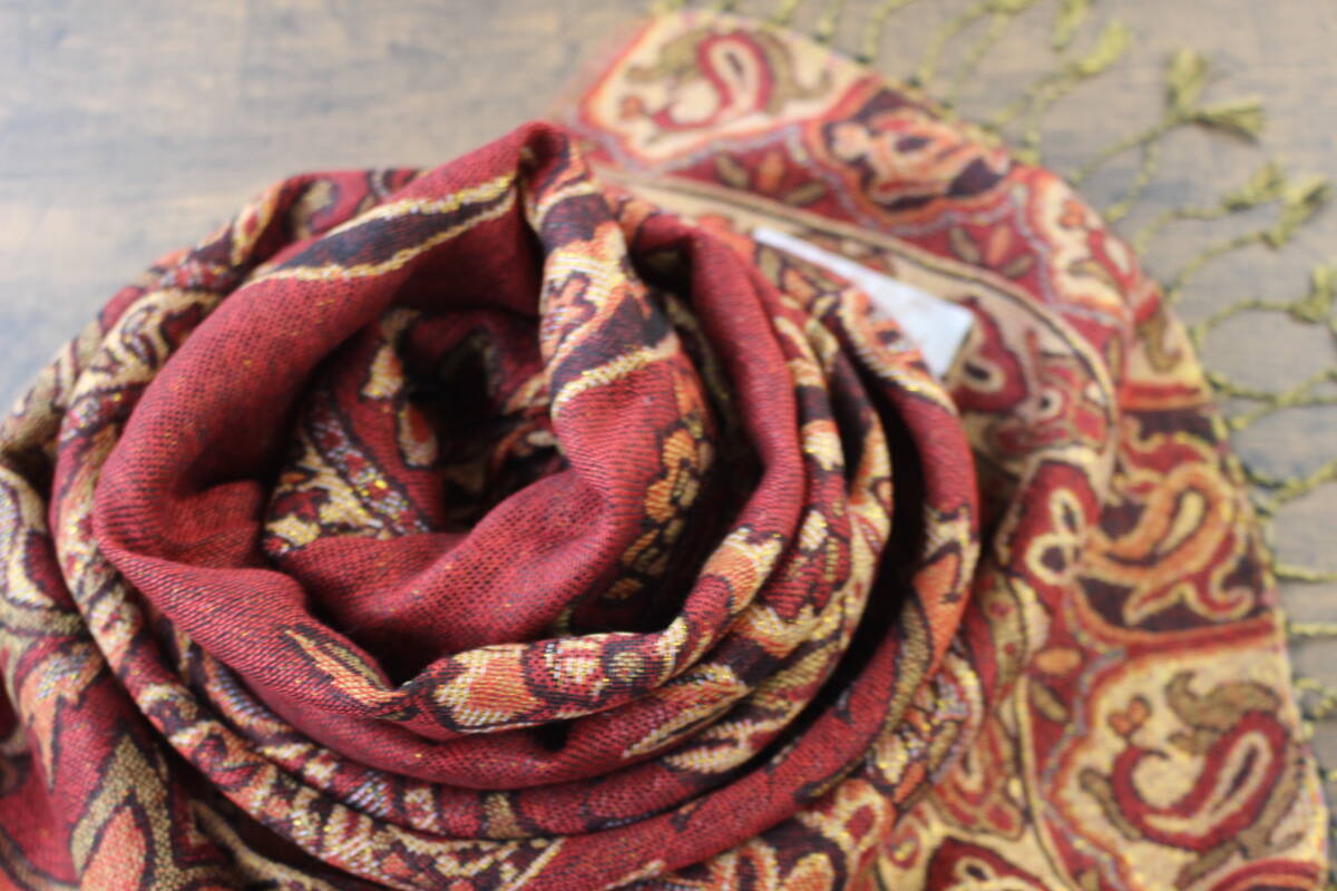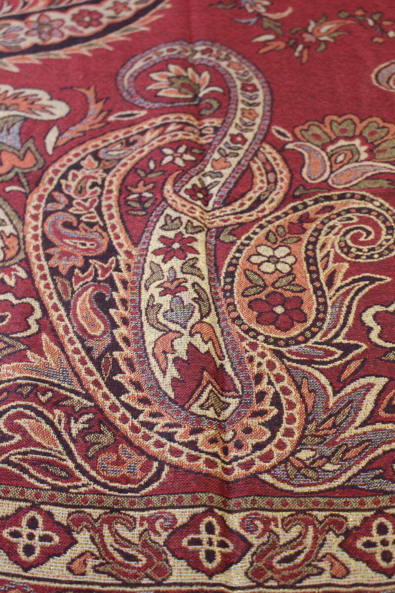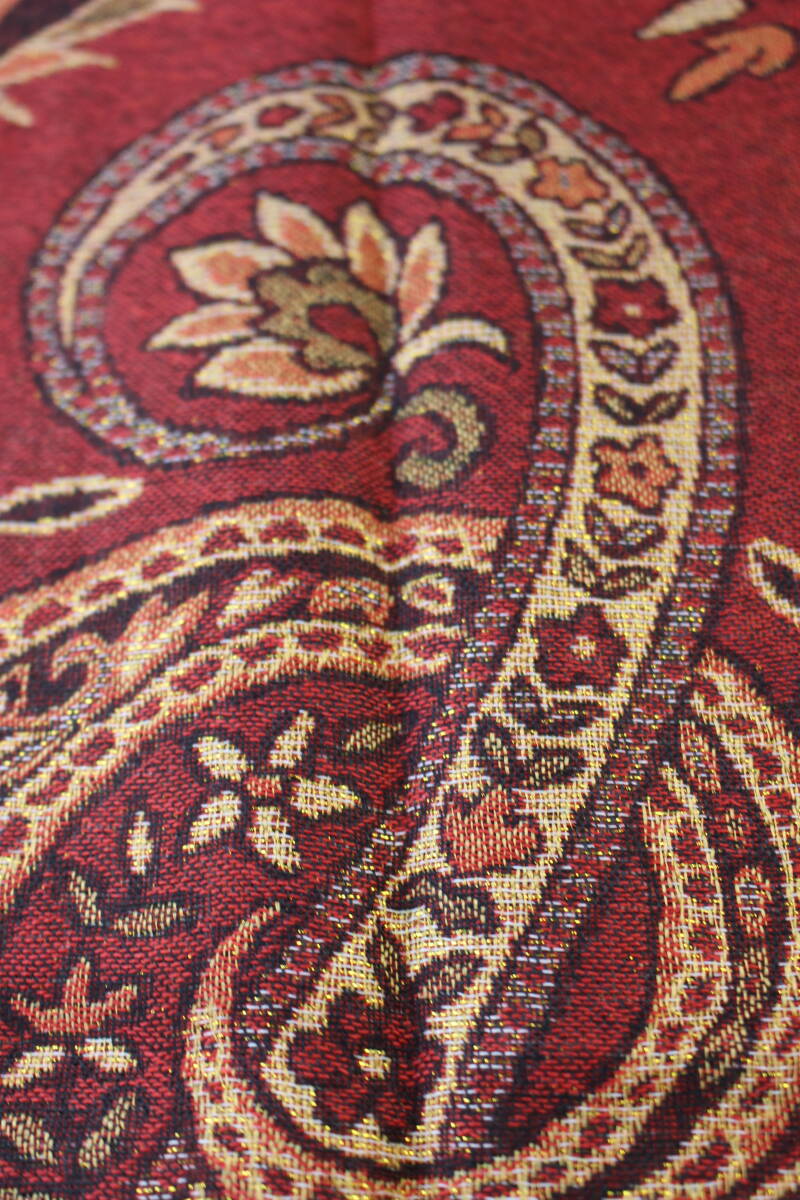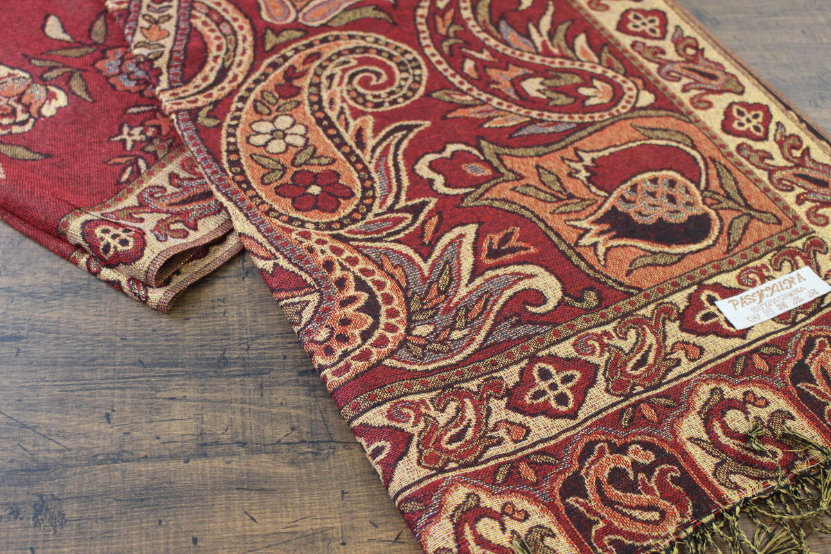 新品【パシュミナ Pashmina100%】金糸混 ペイズリー花柄 ワインレッド 紅赤 W.RED ゴールド 金 GOLD 大判 ストール