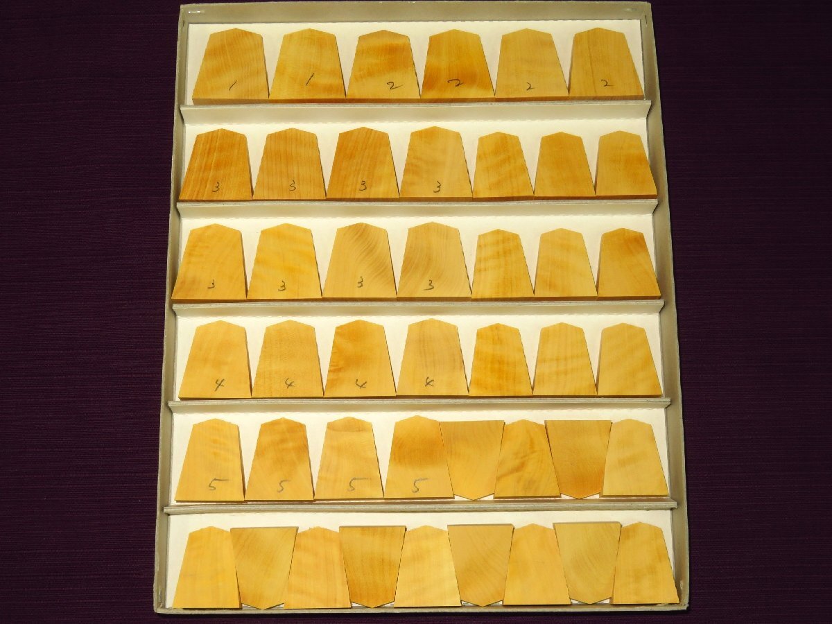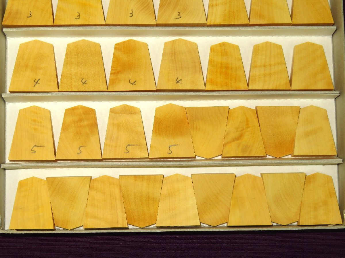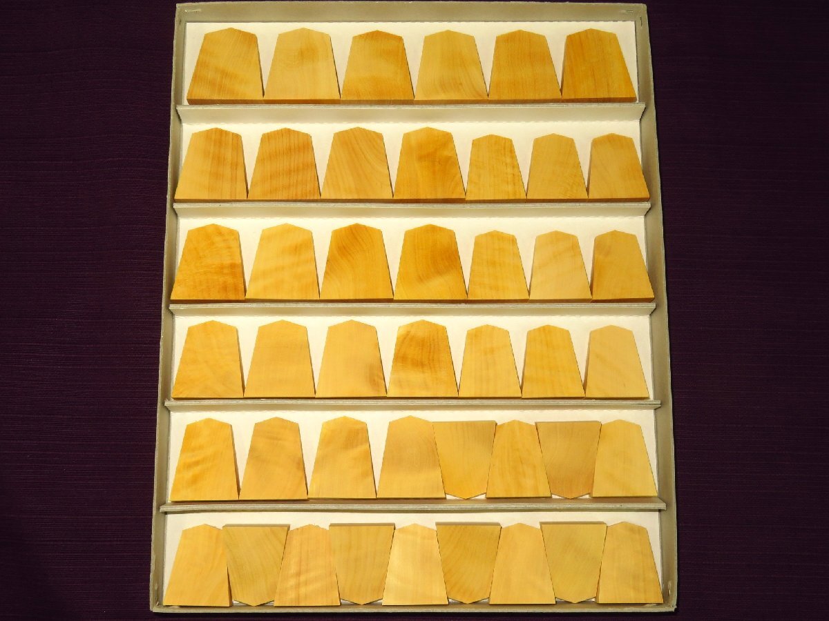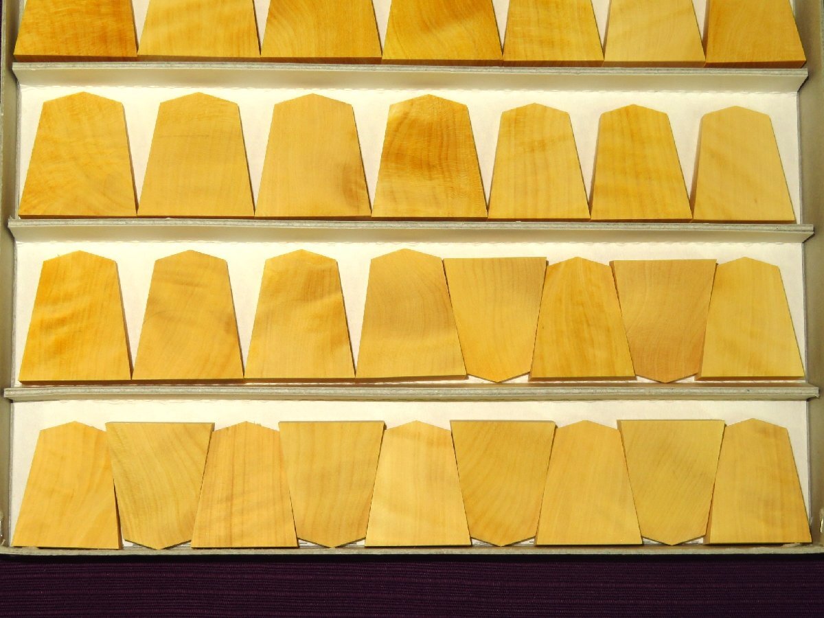 島黄楊、銀目系の駒木地です。成形精度は高いと思います。仕上もよくおそらくこのまま字母紙が貼れると思います。
