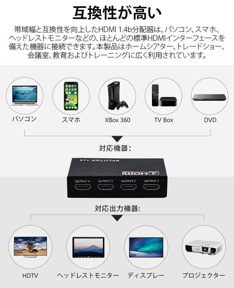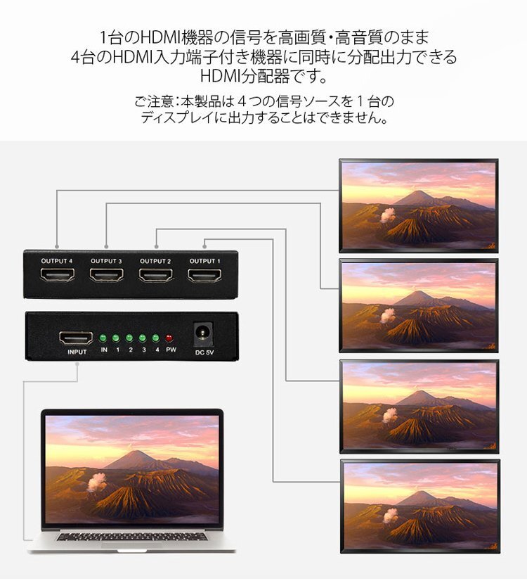 HDMI 分配器 4出力 1入力 4台同時分配出力 Eonon