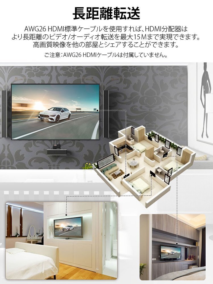 ・AWG26 HDMI標準ケーブル対応:入力最大15M、出力最大15M(解像度4Kの場合は入力最大8M、出力最大8M)