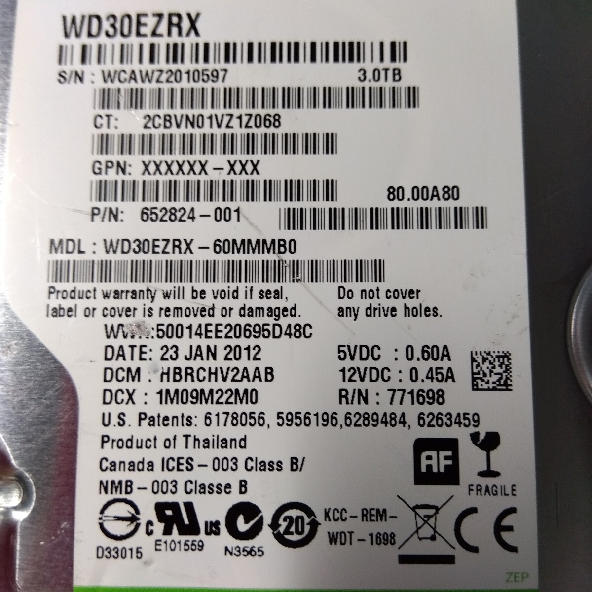 HDD 3TB 3.5インチハードディスク / Crystal DiskInfo 正常 / #310 / Western Digital / WDC WD30EZRX-60MMMB0
