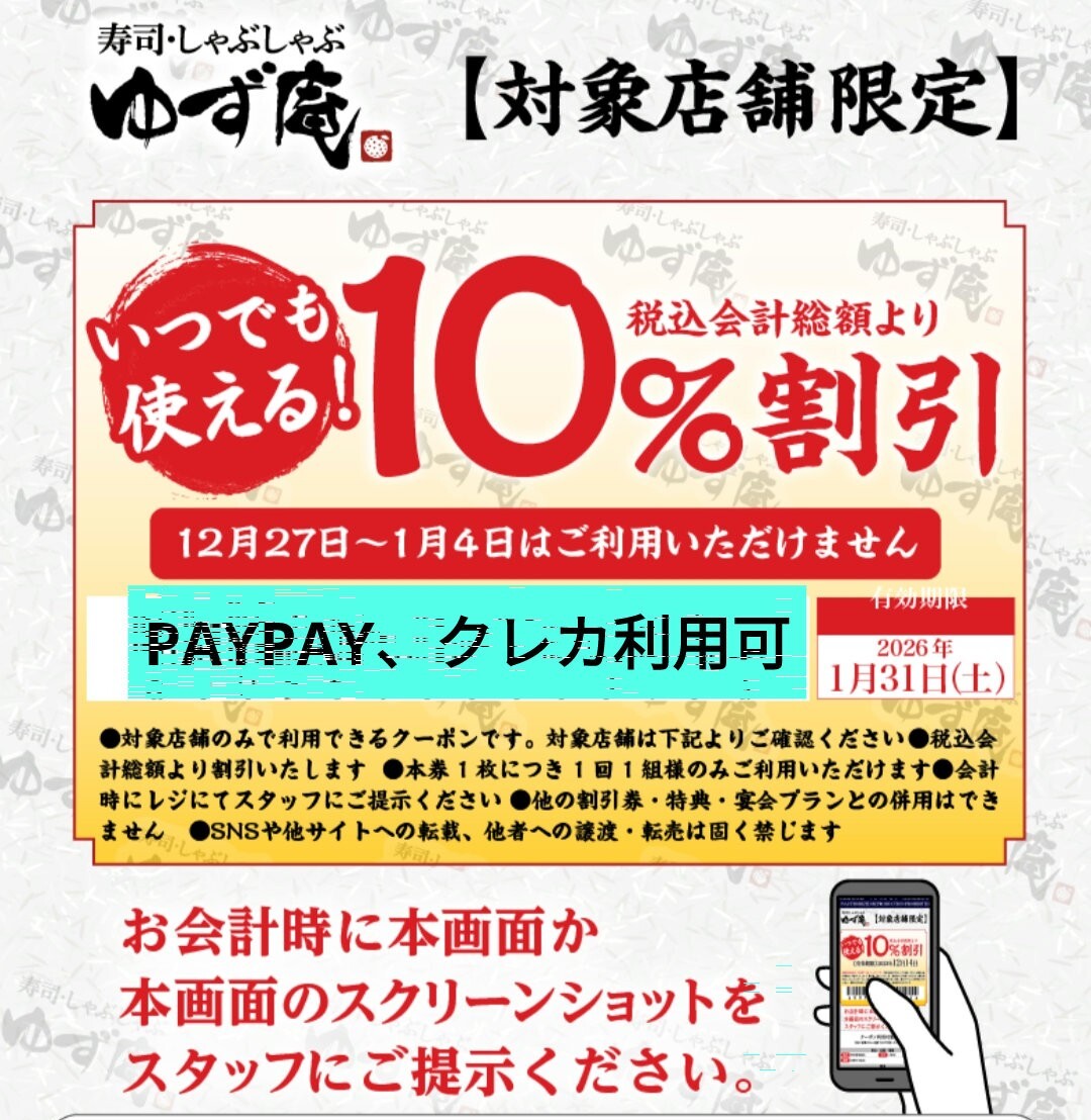 ゆず庵でご利用頂ける最新の10%割引のクーポンです。