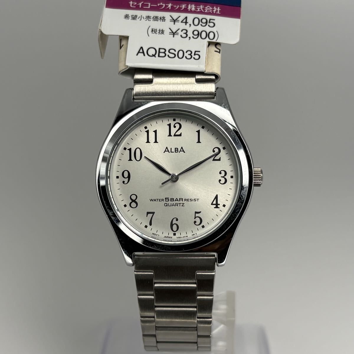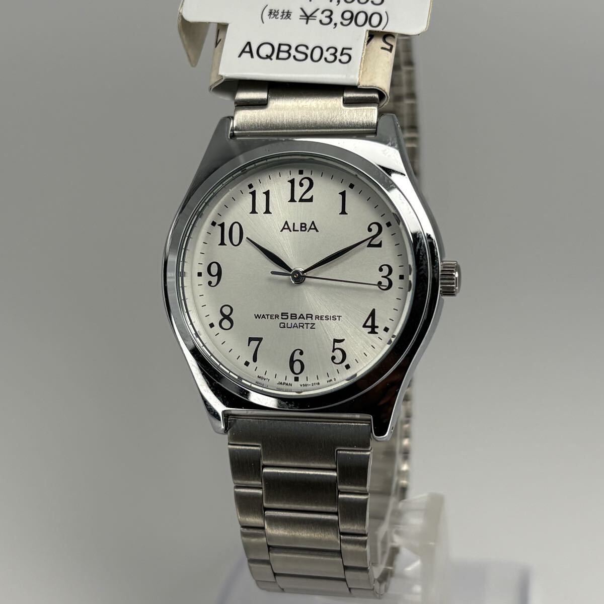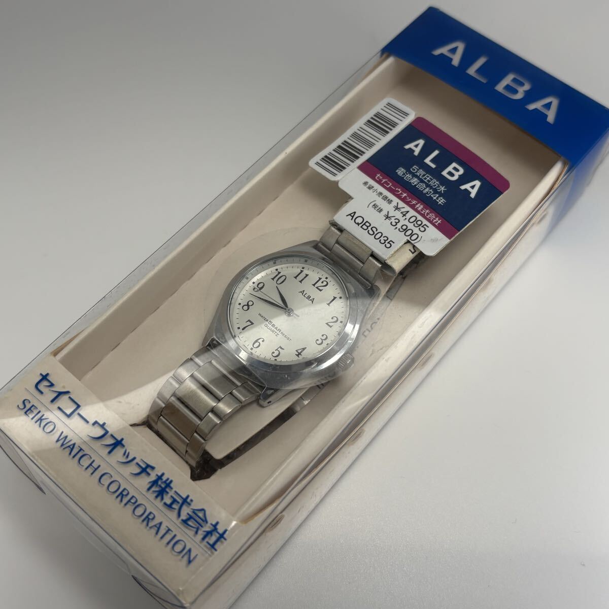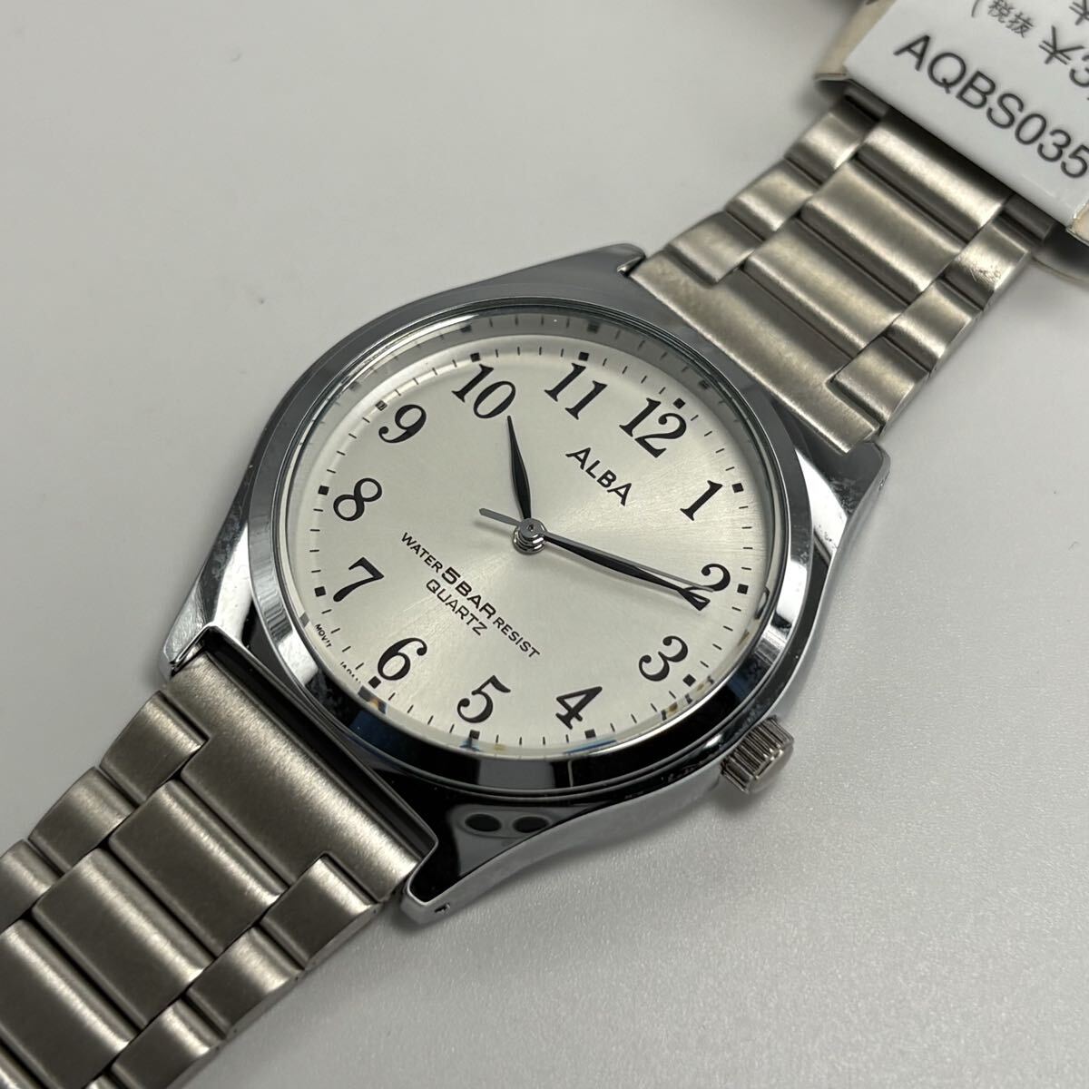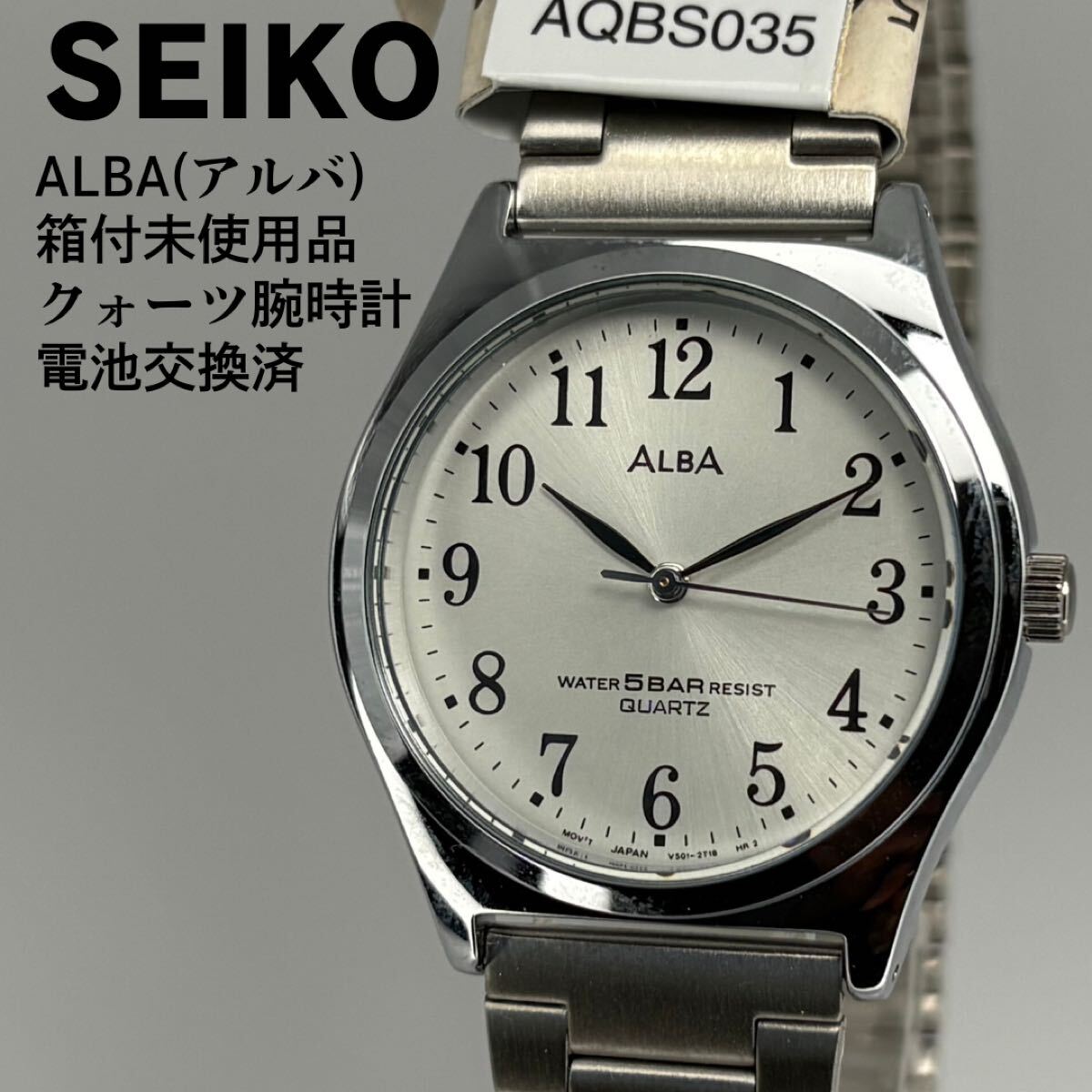 SEIKO ALBA(アルバ)の箱付未使用品・クォーツ腕時計です。シンプルで視認性の高いアラビア数字ダイヤルに、上品なシルバーサンレイ文字盤を組み合わせた万能モデル。5気圧防水で普段使いにも安心、仕事用・学生用・男女兼用の一本としても使いやすいデザインです。保管されていた未使用品のため状態良好、電池交換済みで到着後すぐにご使用可能。箱付のためプレゼントにも最適です。実用的で高品質なSEIKO ALBA、未使用の美品をお探しの方におすすめ。ぜひこの機会にご検討ください。
