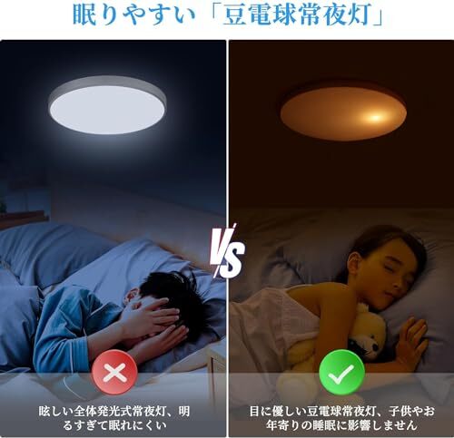 【豆電球常夜灯・記憶機能・定刻消灯】○本格的な豆電球常夜灯(1W):他社の眩しい全体発光式常夜灯と違って、1点だけ発光のため、ちょうどいい感じの暗さで目への刺激がなく、付けまま寝ることに最適です。○進化した記憶機能:他社の記憶機能は常夜灯によって前の設定がリセットされる方が多く、当天井照明器具はいろいろ設定してから常夜灯を使っても、次回点灯時にきちんと常夜灯前の設定を再現しますので、設定がリセットされるため毎日設定し直しの悩みがなくなります!○消灯機能:設定して15/30分後自動的に消灯するため、消し忘れの心配はありません。