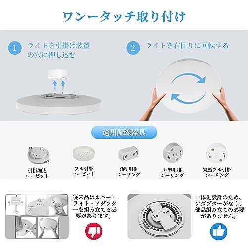 【ワンータッチ取付け】アダプターとライト本体の一体化設計のため、部品組み立ての必要がなく、シーリングライト全体を天井の引掛け装置に押し込んで、右回りに回転するだけで設置完了です。工具・配線も必要がなく、素人で1分間で取り付けます!