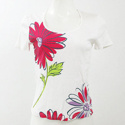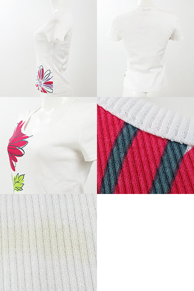 | 大きなフラワープリントが目を惹く一枚♪ シーズンレスに活躍する半袖Tシャツは何枚あっても困りません。 細いリブ上の生地で収縮性に富んだストレッチ素材が◎! スカートにINするガーリーコーデやパンツにさわっとあわせてカジュアルコーデにと着回しが利きますよ。 首周りと裾に使用感を感じますが、まだまだお使い頂けるお品です。 着丈約52㎝ 袖丈約14㎝ 肩幅約36㎝ バスト約72㎝ 【サイズ】:(36) 【素 材】:(綿96%・ポリウレタン4%) 【 色 】:(白) 【程 度】:(B) 12140625-007 139 027 | ||||