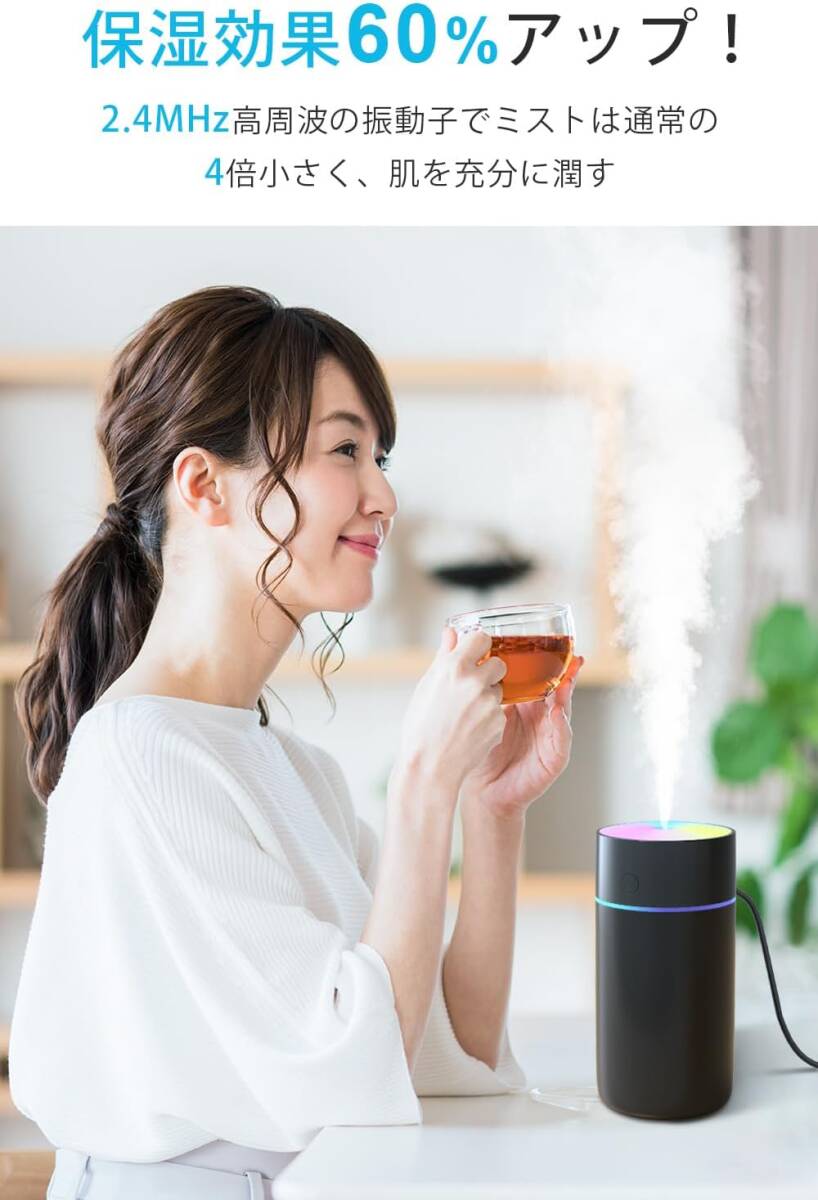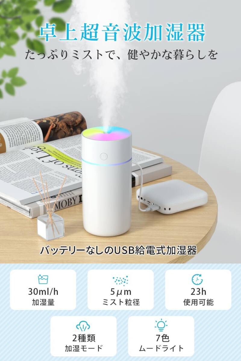 超音波式で細かいミストを素早く広げ、350mlの容量で長時間しっとり加湿できます。