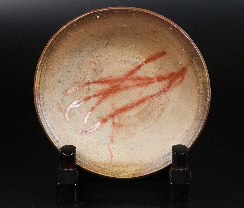 【 金重陶陽 】秀逸作 備前火襷丸皿 五 人間国宝 初代黒田陶々庵識箱 保証 15507