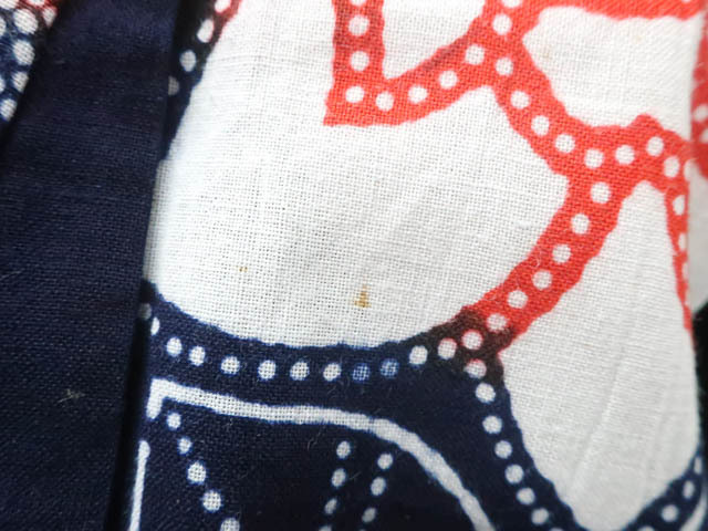 肩当て、居敷当て付きです。 リサイクル商品のため、所々に点シミ汚れがございますが着用可能なお品です。 地色は紺です。 1枚目の画像が近いお色かと思われます。 素材は綿です。 |