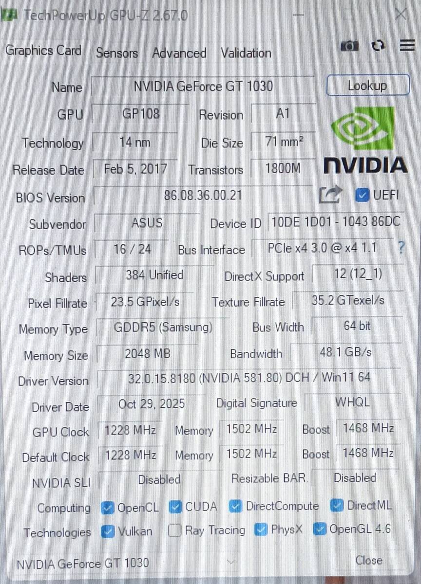 【中古パーツ】NVIDIA GeForce GT 1030 2G グラフィックボード/ビデオカード PCI-E HDMI/DVI■K1613-2