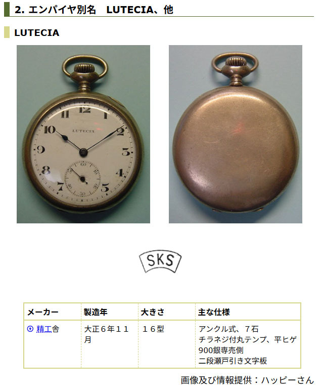 「エキセレント」は高級機であるため量産できず、「タイムキーパー」は輸入シリンダー脱進機の供給途絶が問題で「タイムキーパー」にかわる一般向けのアンクル脱進機懐中時計の量産が課題となっていました。そこで精工舎がムーブメント部品すべて自社加工の新製品として製造されたのが、「エンパイヤ」です。エンパイヤは良く売れ、初期のものは機械の仕上げが丁寧でダマスキーンと呼ばれる模様があり、 文字板は瀬戸引きで銀側のケースに納めて販売されることが多く、値段は740銭でした。