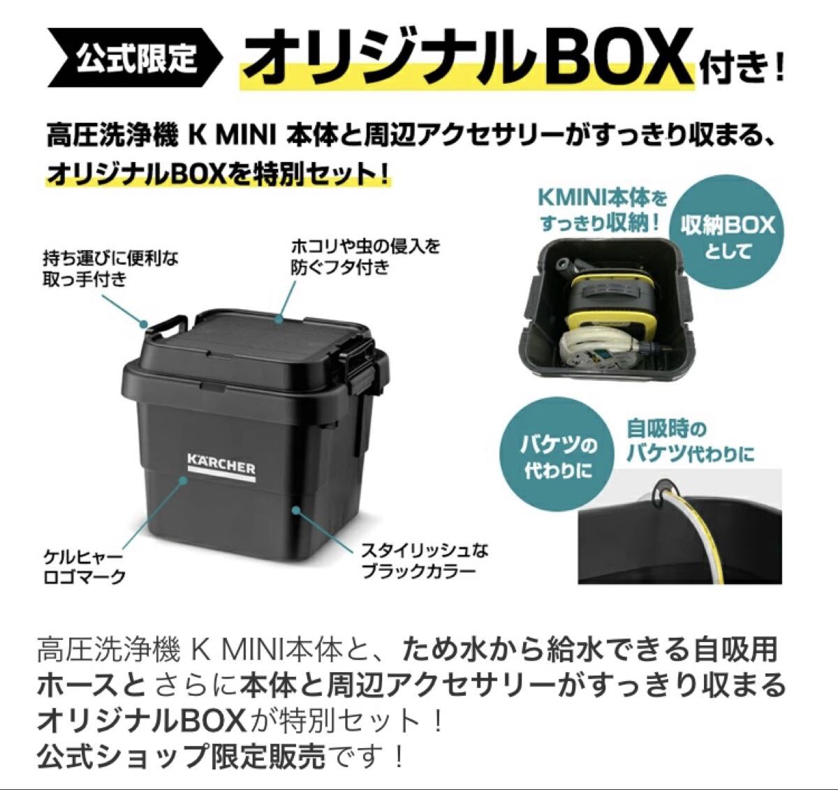 【公式限定セット】 K MINI&特別BOX&自吸ホース 最もコンパクトな高圧洗浄機 K MINI 軽量 小型 簡単接続 高い収納性 しなやか高圧ホース 洗車 泥 花粉除去効果 黄砂 1.600-071.0 ケルヒャー(Karcher)