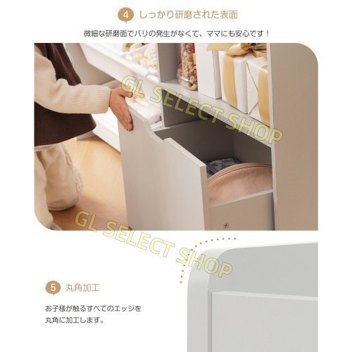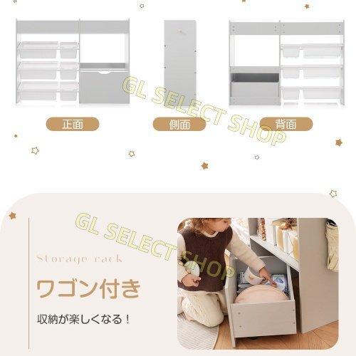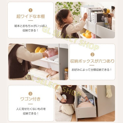 • POINT 3 【たっぷりの収納力】収納スペースがいっぱいあり、好みによって分類収納できる!①超ワイドな本棚:絵本とおもちゃがいっぱい収納できる!②収納ボックスが六つあり:お好みによって分類収納できる!③ワゴン付き:人に見せたくないものを収納できる!④おやつとランドセルラックを収納できる!⑤傘とバッグなどを収納できる!