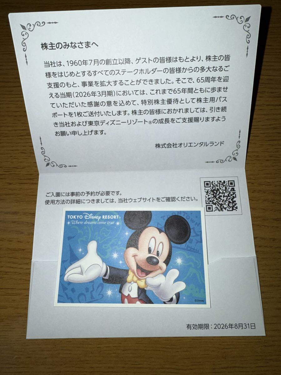 オリエンタルランド株主優待パスポート1枚です。(有効期限2026年8月31日までです。) 使用方法や注意事項等詳細は公式サイトでご確認ください。よろしくお願いします。