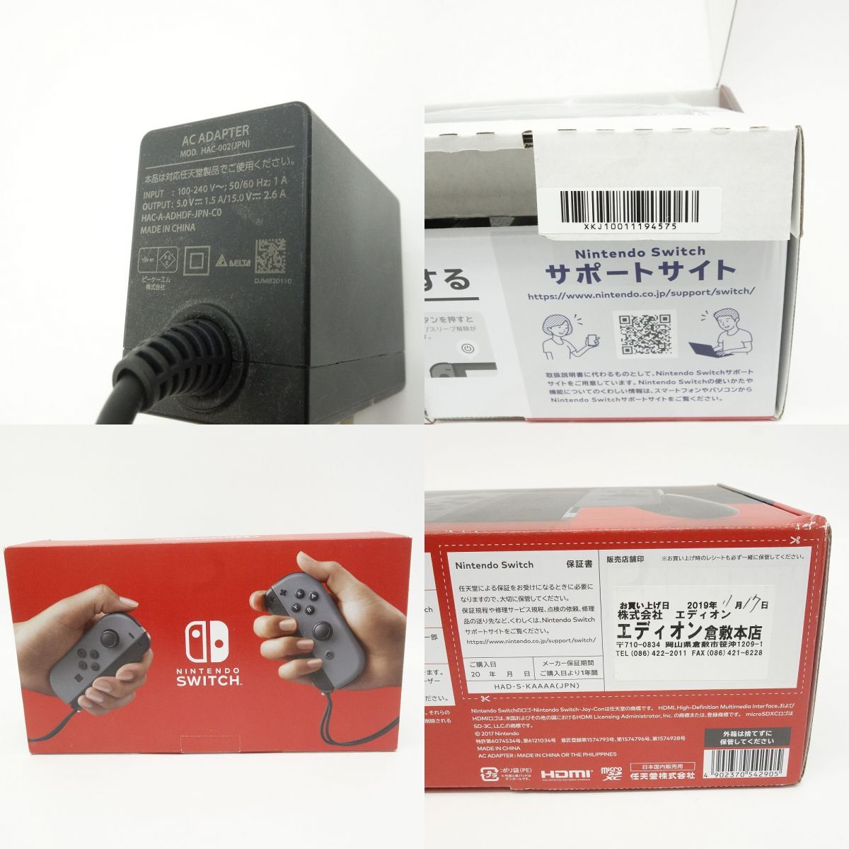 056 任天堂 Nintendo Switch ニンテンドー スイッチ 本体 グレー HAD-S-KAAAA ※中古 □内容品:完品 ※画像にあるもので全てです。 □型番:HAD-S-KAAAA br>□保証:無し(期限切れの為) □バージョン:21.0.1 □動作確認内容 ・通電および起動確認済み ・wi-fi接続、ソフト読込、各ボタン操作OK ・初期化済 ※動作確認環境の関係上、上記のみの確認となります。 動作確認内容以外に不良があった場合の当方の対応は 返品・返金のみの対応となります。 □状態 ・本体、液晶、グリップはスレ、キズ、汚れ、ホコリ付着が見受けられます。 ・joy-conはテカリ、スレ、キズ、スティックはスレ、キズ、汚れ、ホコリ付着、若干べたつきがあります。 ・ACアダプターはスレ、キズ、ACアダプターやHDMIケーブルの差込口は汚れ、くすみがあります。 ・外箱は保管によるスレ、キズ、汚れ、ヘコミ、破れ、角の傷みが見受けられます。 ・クリーニングは行っておりません。 ※クリーニングや消耗品の交換が必要な場合は購入者様でご対応ください。 ※画像では判別しづらいUSED品特有の薄い汚れや薄いキズ、細かいキズなどある場合があります。 |
