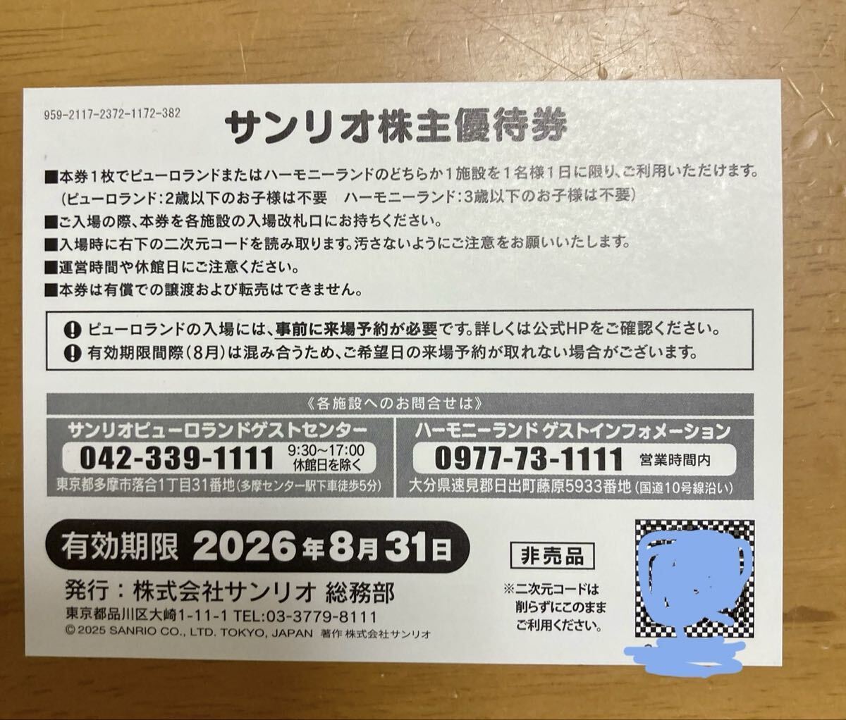 サンリオ 株主優待券 1枚セット 未使用です。
