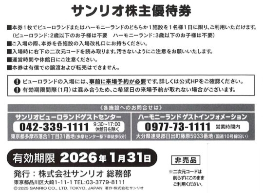 (サンリオピューロランド:2歳以下のお子様は不要、ハーモニーランド:3歳以下のお子様は不要)