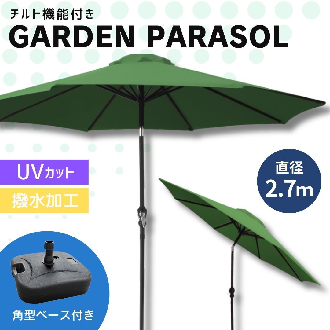 | \ バーベキューにピクニックにビアガーデンと晴れた日には欠かせないアイテム / 日差しの向きにあわせて傘の角度調整ができる便利なガーデンパラソルです。 日差しに合わせて角度を変えられるチルト機能を搭載しているので直射日光対策にぴったり。 ボタンを押すだけのカンタン操作なので、角度を調整しやすくとっても便利です。 パラソルの開閉には、普通の傘とは違いハンドル式を採用。 ハンドルをクルクルと回すだけで開閉できるので、これほど大きなパラソルでも女性一人で簡単に開閉できます。 UVカットが施された270cmという大きなパラソルが強い日差しから守ってくれるので、 直射日光を気にせず快適にガーデンライフを楽しんでいただけます! 撥水加工も施してあるので、急な雨にも安心です。 アルミ製支柱なので木製パラソルと比較して軽量! ご自宅のお庭、バルコニー、テラスや店舗先のカフェペースなどにお使いいただけます。 河原でのバーベキュー、夏場にお子様のプール遊びの時にご使用になっているお客様もいらっしゃいますよ♪ ■商品コード: パラソル:ACB002GR ベース:ODTT14A ■商品仕様 (パラソル) カラー:グリーン 素材:ポリエステル、スチール、アルミ 重量(約):4.6kg サイズ(約) ・使用時:傘幅270cm×高さ240cm ・収納時(パラソル):140cm×25cm ・収納時(ポール):長さ110cm ・ポール直径:3.8cm (ベース) カラー:ブラック サイズ(約):幅450×奥行450×高さ270cm 重量(約):1.5kg 水を入れた時の重量(約):21.5kg 対応パラソル(約):直径40mm対応 材質:ポリエチレン他 ■注意事項 ・傘生地には撥水加工をしておりますが、完全防水ではありません。 ・風や雨が強い日の使用は危険ですので、ご使用しないでください。 パラソルやベースを地面に固定しても突風や瞬間的な豪雨などでパラソルが破損する場合がございます。 そのような自然現象による破損につきましては保証の対象外となりますのでご注意ください。 ・商品は、モニターによって色合いが異なって見える場合があります。 ・仕様・デザインは改良のため予告なく変更することがあります。 ■保障期間 7日間 ※商品到着後7日以内の初期不良・破損のみご対応させていただきます。 【新品未使用品です】 |