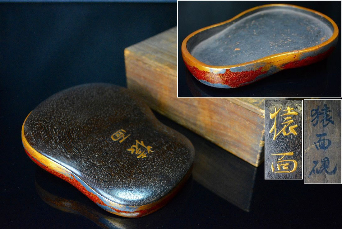 江戸時代 猿面硯 時代蒔絵 古硯 唐木蓋付 共箱 書道具 古美術品 D1193 |