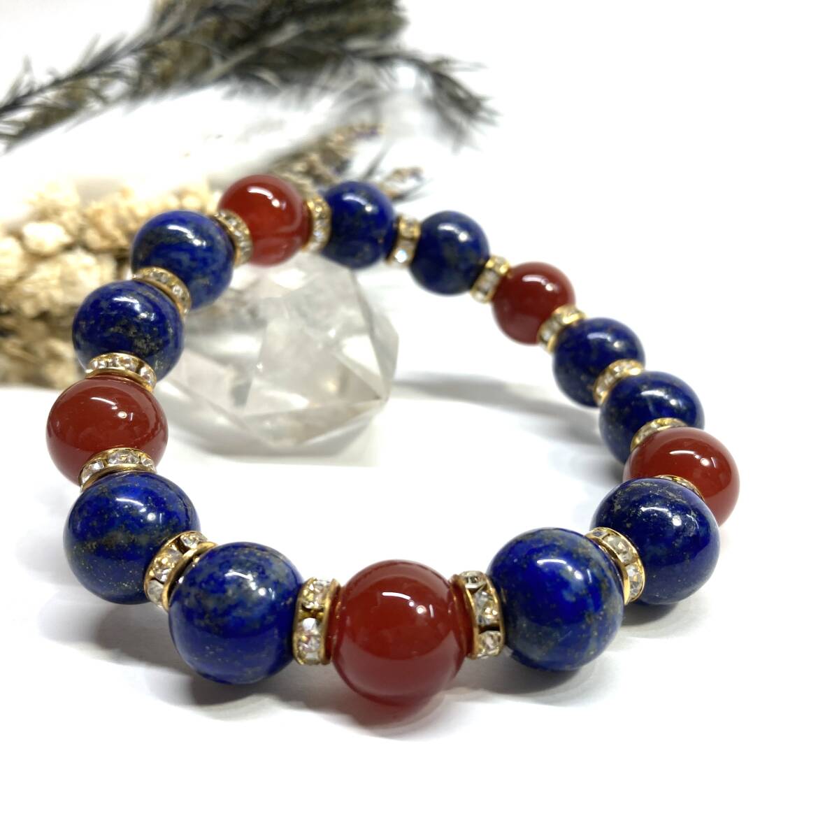 こちらは、ラピスラズリと赤瑪瑙を組み合わせたパワーストーンブレスレットです。間にはロンデルを挟み高級感あるデザインに仕上げております。程よくインパクトがある12mm玉を使用して内周約18cmです。(サイズ変更の場合は取引ナビにてご連絡をお願いします。) 数に限りがございますので気になる方はお早めにどうぞ。