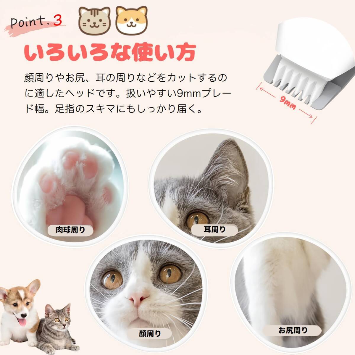 刃幅は9mmと非常に小さく、お尻周り/目周り/耳周り/顔周り/肉球周り/足指の隙間など、狭い隙間の毛をきれいに刈り取ることができます。