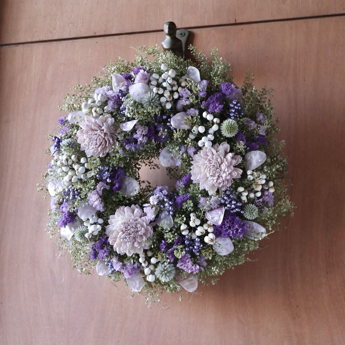 ※こちらのスワッグは他の作品と合計3点まで同梱可能です。同梱時は2点で送料+200円、3点で送料+400円になります。 ※他のサイトでも販売しておりますので、急に出品を取り消す場合がございます。 小さな丸い実が可愛いマメグンバイナズナをベースに、パープル、ピンク、ホワイトのお花や実物をギュッと詰め込み、細かく作り込んだリースです。 メタリックなパープルのペッパーベリーをアクセントに散りばめ、繊細で華やかな雰囲気に仕上げました。 ドライフラワーをメインにハンドメイドフラワーを組み合わせて作っております。 長持ちする花材で作っておりますので、綺麗な状態で長く楽しんでいただけます。 麻紐のループが付いておりますのでフックやピンに掛けて飾っていただけます。 画像10枚目は梱包例です。 無料でリボン、メッセージカードもお付けできます。 使用花材 ソーラーダリア(ハンドメイドフラワー)、マメグンバイナズナ、スターチス、ペッパーベリー、ナンキンハゼ、ルリタマアザミ、ルナリア等 横幅30cm 厚み12cm ドライフラワーは自然のものですのでゆっくり退色していき、 徐々にベージュ系の色合いに変化します。 直射日光を避け、できるだけ湿度の高い場所を避けて飾っていただければ綺麗に長持ちいたします。 ※商品の性質上、輸送中のわずかな実や葉落ちはご容赦ください。 |