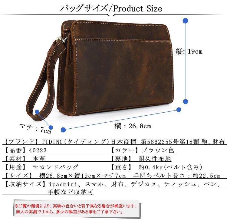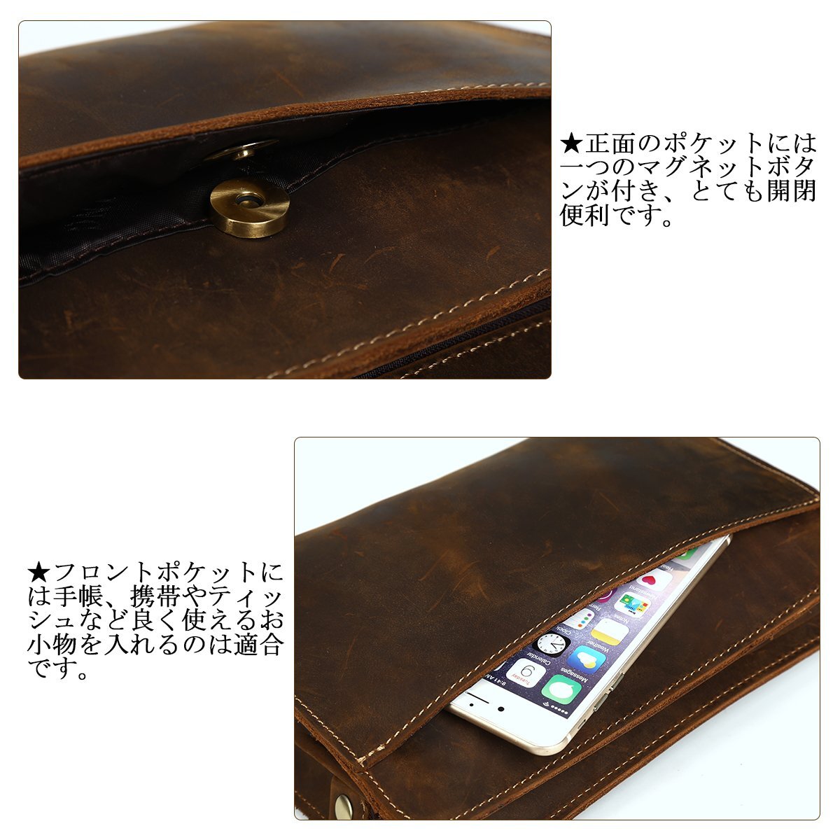 コメント: 人気新シリーズ「アンティーク風バッグ」登場!今季人気新作最高級な本革レザー3wayセカンドバッグが新登場。このバッグは手頃なサイズで持ち運びやすいです。ストラップで手提げる時、使い込むほど馴染んで心地良くなっています。ビジネス時や着席時や運転時、手を離しても、椅子と床に置いた時もしっかりと自立するものが理想的です。思わず周囲の視線を集めてしまう、存在感あるセカンドバッグです!外出、ビジネス、運転中、デートなどに大活躍!非常に重宝です。気兼ねなく毎日でも使うことができます。また、外観は非常に小さく見えますが、収納性も抜群です。ストラップは着脱式です。 お手軽セカンドバッグとハンドバッグを腋にかかえる仕様と手持ちバッグを気分によって、変えられます。多機能なのが人気のセカンドバッグですね。バッグのフロント帽子のようなマッグボタンを開く、貴重品が入れても、超安心です。500mlペットボトル、折り畳み傘、携帯電話、デジタルカメラ、 財布など楽々余裕収納可能です。また、バッグのメインポケットは仕切りがありますので、物の出し入りは整理上手です。裏側にはファスナーポケットがありますね! たくさん荷物を入れる方も整理上手でとっても便利ですよ。また、ブラウン色で復古的な感じが漂っています。年齢問わず長く愛用されています。自分へのご褒美バッグや特別な方へのプレゼントに最適♪。全身厚手な本革製ですが、特にストラップを含む、厚手感のある素材が使用した落ち着いた雰囲気の高級なバッグです。また、バッグの真ん中にオリジナルブランド「TIDING]ロゴ印刻が押されています。限定生産で、全正規品です。お客様は絶好のチャンスがお見逃しなく!