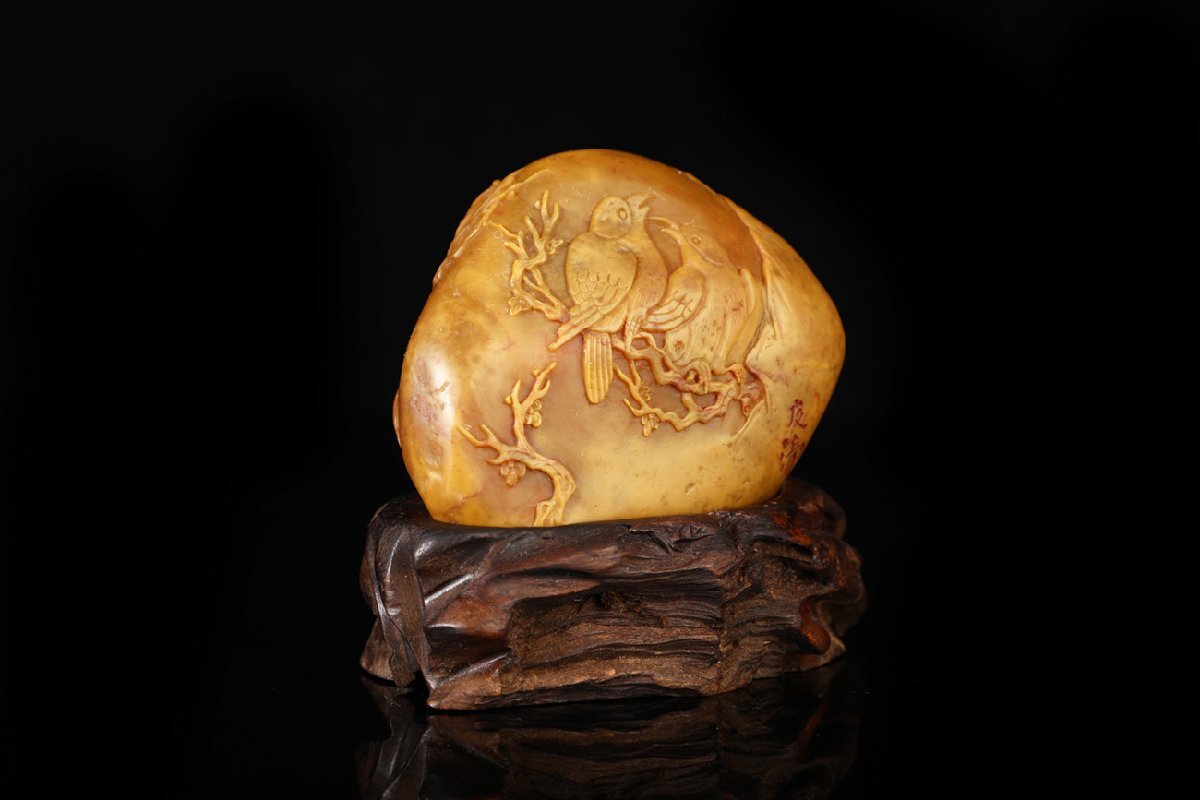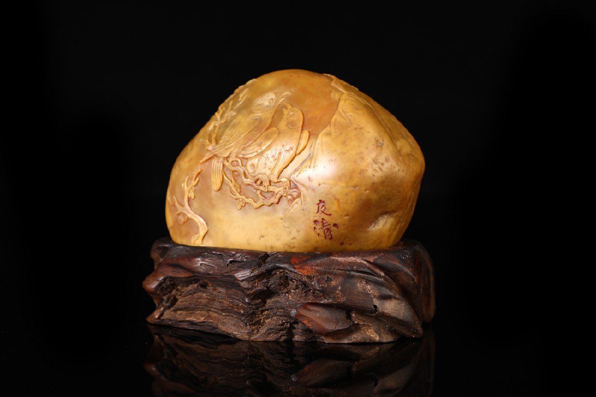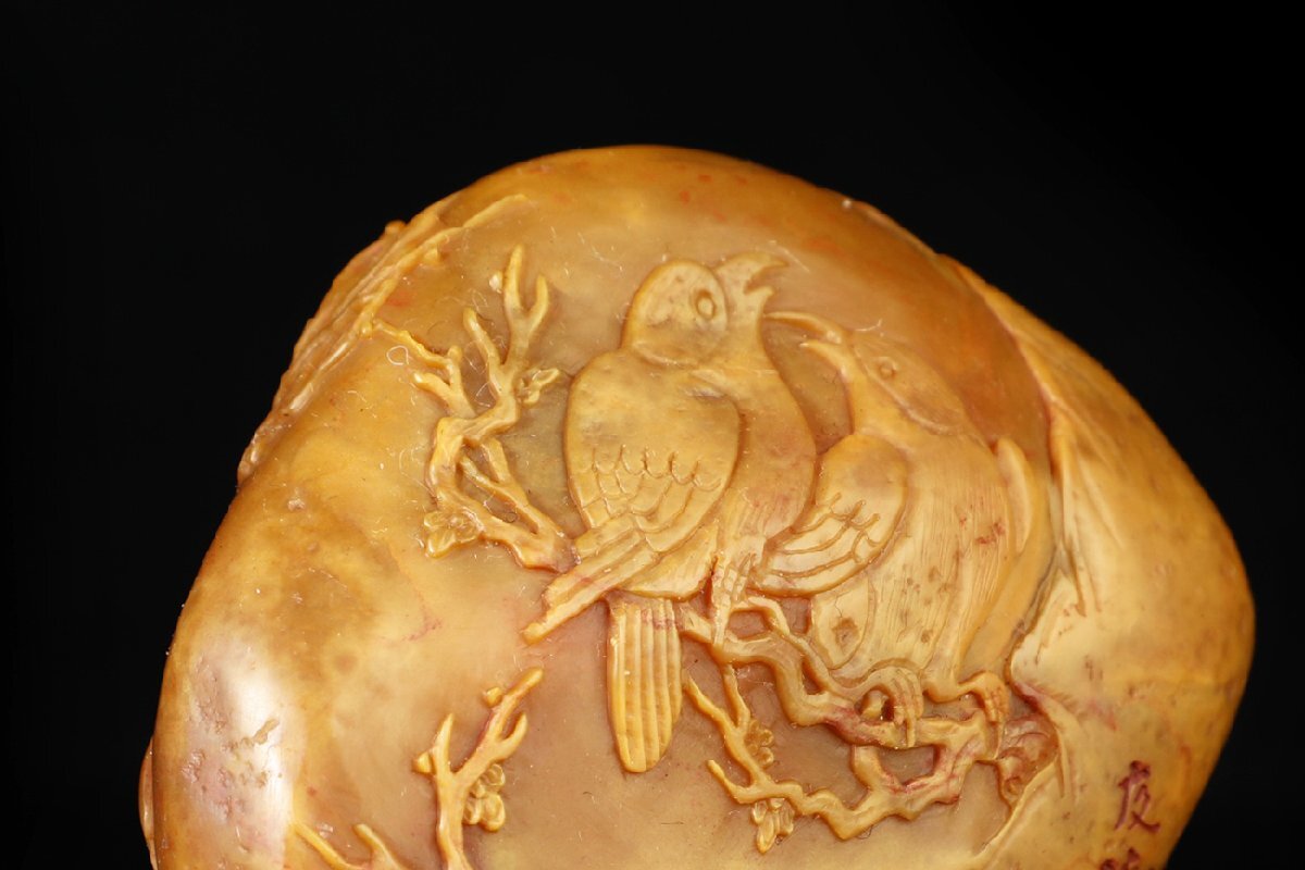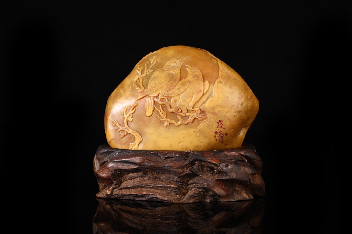 【安】清時代 友清銘 寿山田黄石彫 喜上梅梢紋山型置物 台座付き 共箱 極細工 古擺件 中国古美術 時代物 265 サイズ(約寸) |
