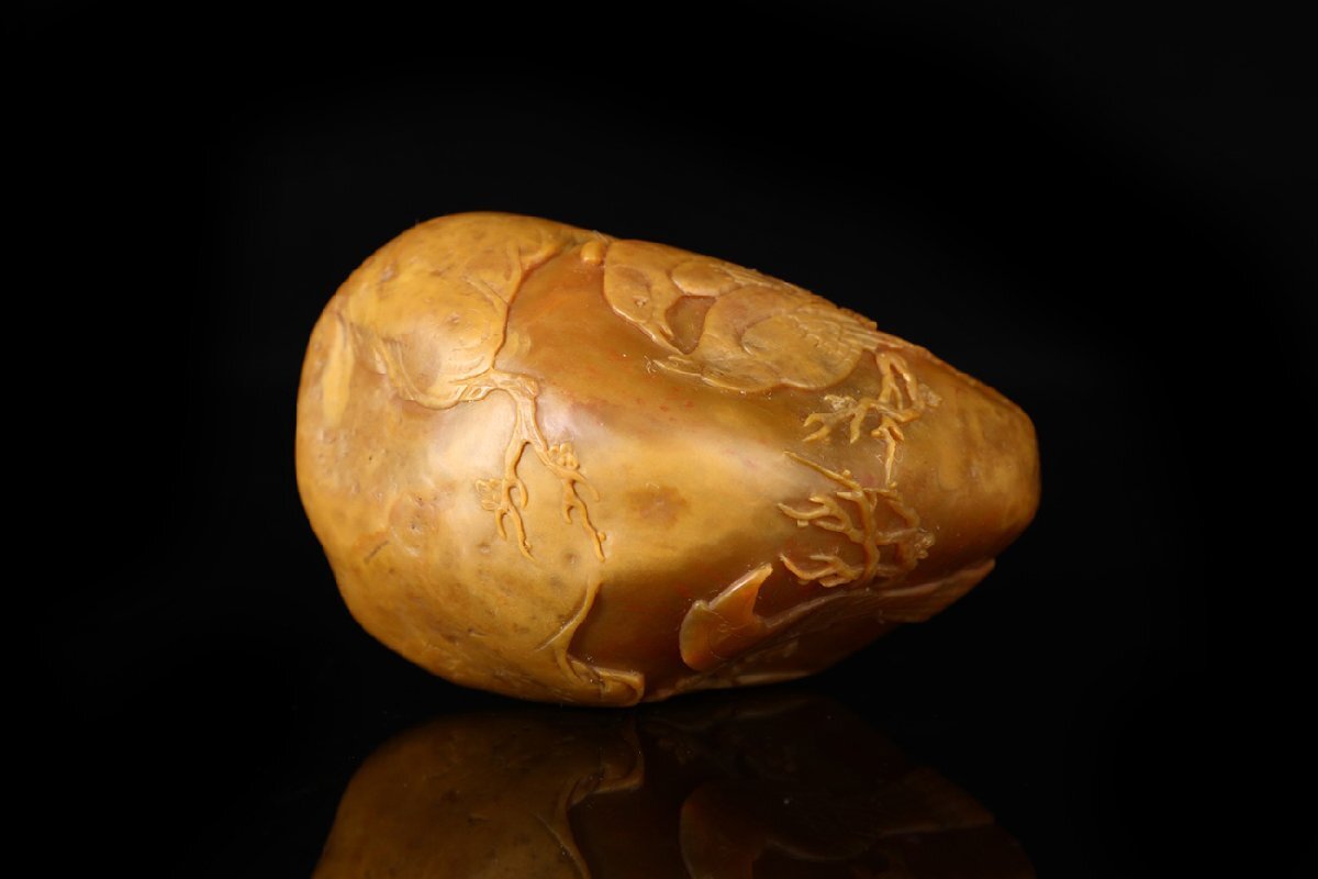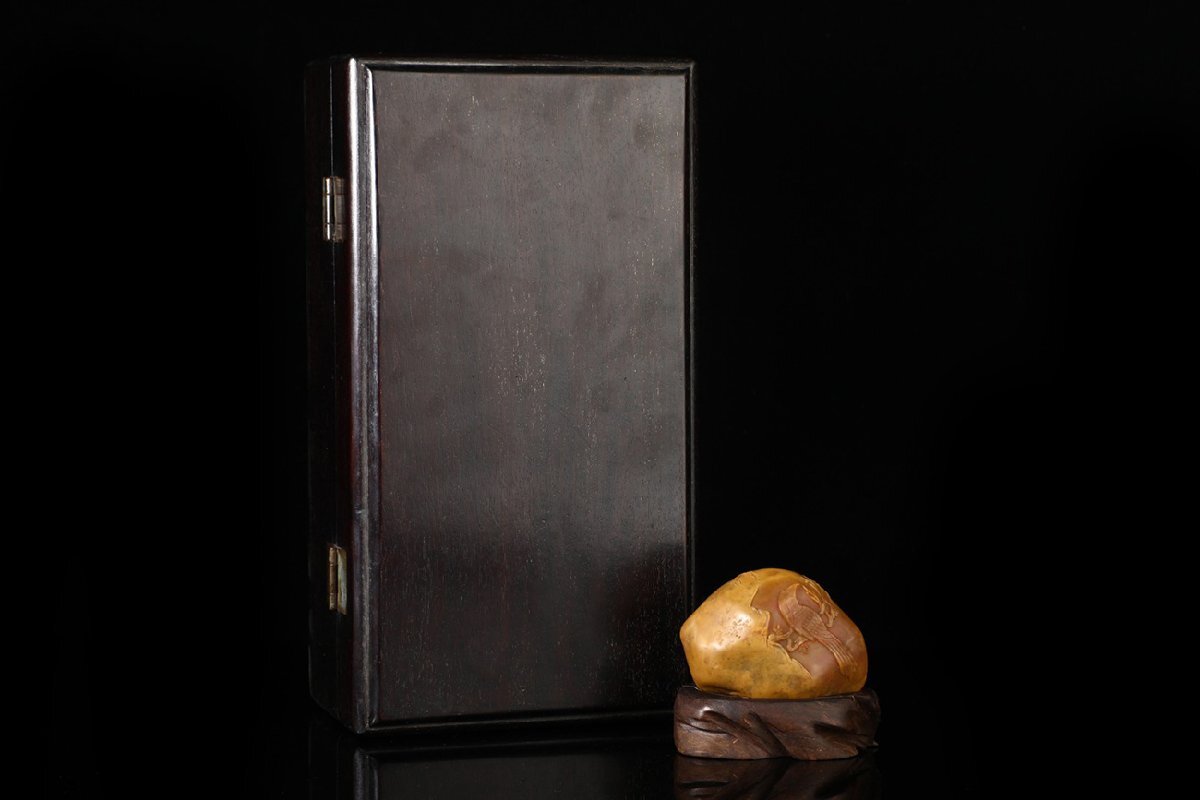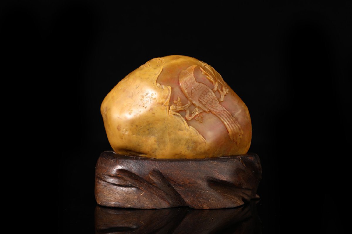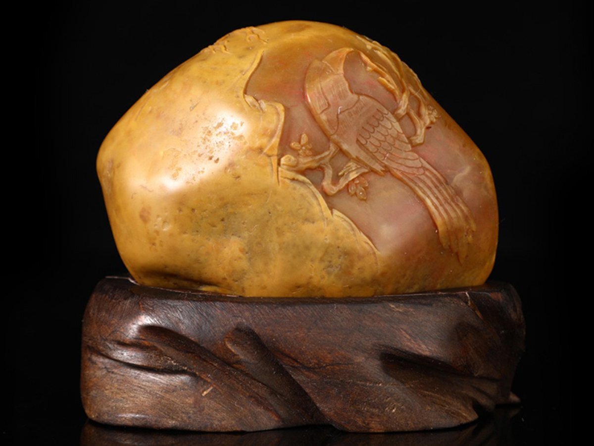 【安】清時代 友清銘 寿山田黄石彫 喜上梅梢紋山型置物 台座付き 共箱 極細工 古擺件 中国古美術 時代物 265 サイズ(約寸) |