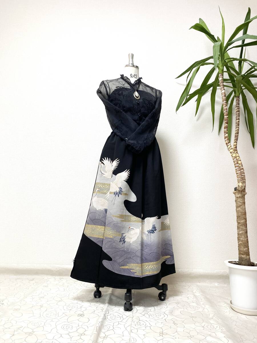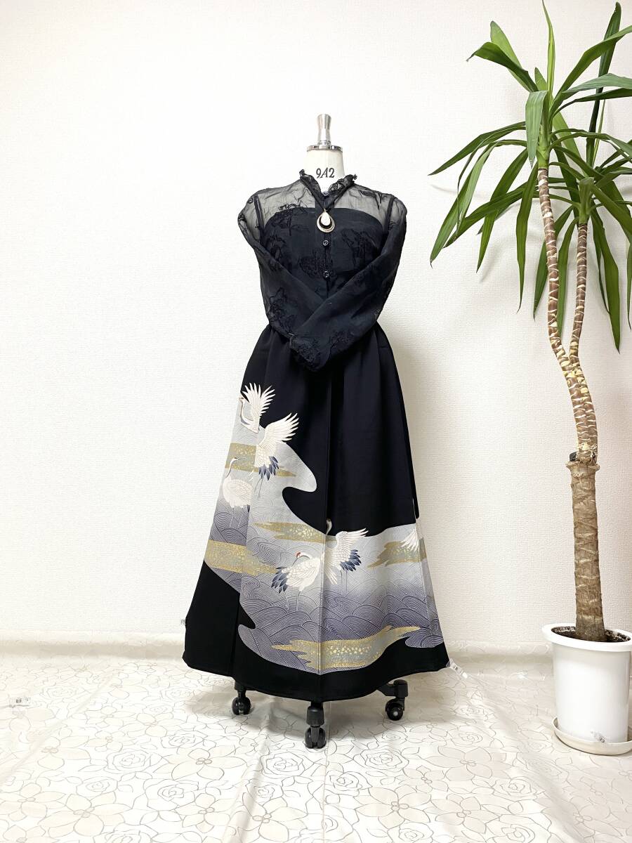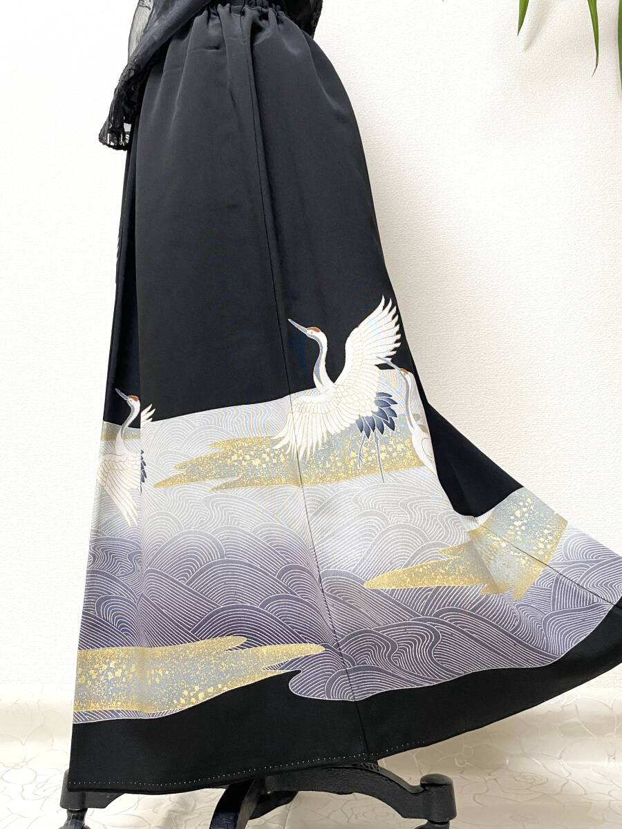 大人可愛いセレブ着物スカートフリーサイズ黒留袖着物リメイクウエストゴムロングスカート