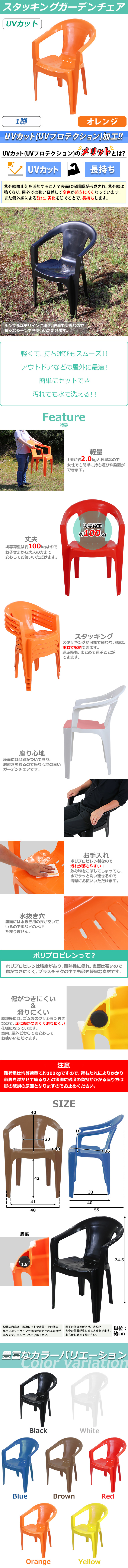 ●UVカット加工によって屋外での強い日差しで変色しにくくなっています。 ●紫外線による酸化、劣化を防ぐことにより、長持ちする作りになっています。 ●スタッキング構造なので重ねる事が可能なので、収納やまとめて運ぶ際にも大変便利です。 ●座面には水抜き穴が空いているので雨などの水がたまりません。 ●本体重量は約2kgと軽量タイプなので、女性でも軽々持ち運べます。 ●材質は、軽量、安全、防水のポリプロピレン(PP)です。 ●完成品なので届いたらすぐにお使いいただけます。 注意! 背もたれによりかかり前脚を浮かせて座るなどの後脚に過度の負担がかかる座り方は脚の破損の原因となりますのでお止めください。 ■重量:約2kg ■均等荷重:約100kg ■材質:PP[ポリプロピレン](本体)、ゴム(脚裏) ●商品のカラーはオレンジとなります。 ●新品商品ではありますが、輸入商品の為、多少の擦り傷などがある場合がございますので、ご納得の上ご購入下さいませ。 ●ご購入後、お客様ご都合によるご返品、ご返金等は一切お受け致しておりません。 ●本商品を使用した際に発生したトラブル、事故につきまして、当社は一切の責任を負いません。ご使用に関しましては、全て自己責任にてお願い致します。 |