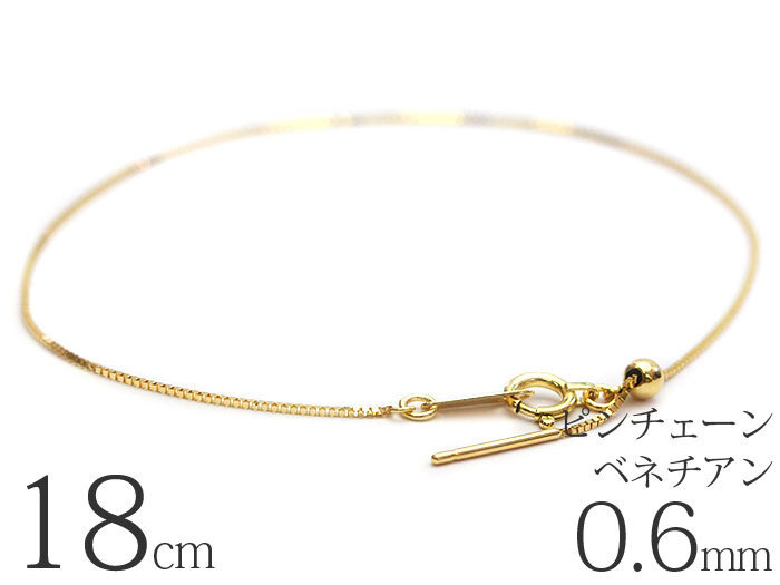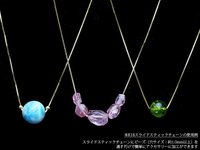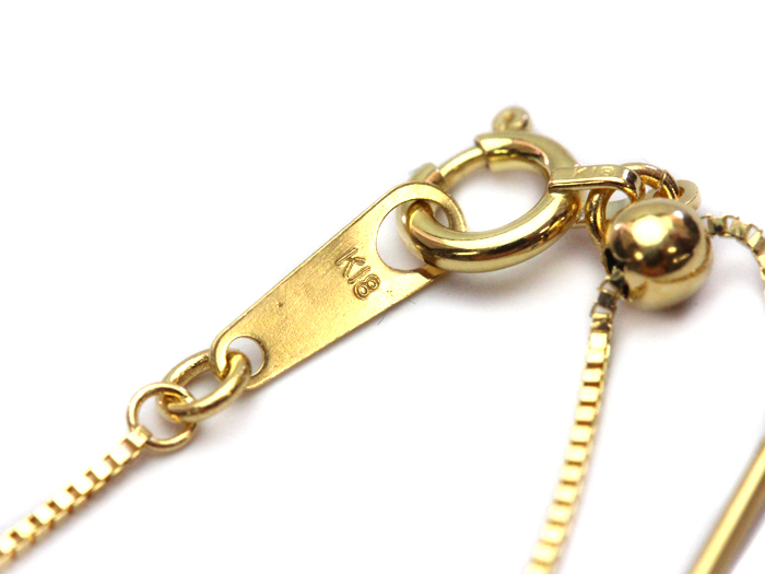 | 日本製の高品質K18ブレスレットチェーン。 素材:18金イエローゴールド 長さ:18cm 線経:0.6mm 重さ:0.78g 画期的な18金のスライドピンチェーンが入荷しました。 スライドピンチェーンの先端からボール部分に通すので約1.0mm程度の穴があればパワーストーンビーズを通しお好みのアレンジを食わることが可能です。 特徴 純金(24金)に対し、ジュエリーに利用されるのに一般的なものが18金です。 18金とは、18金÷24金=0.75、つまり、75%が金で残りの25%が他の金属ということになります。 出来るだけ金の純度を落とさずに、ジュエリーとして使用する必要な硬さを得るために、75%の金に25%の他の金属を混ぜて使うことが一般的とされているそうです。 ※スライドピンチェーンご使用時の注意事項 シリコン入りボール・ピンチェーンの摩耗・破損を防ぐために、着脱時は引き輪部分をご使用ください。 過度にピン部分を抜き差しされますと、ピンの脱落などの原因となります。 穴の小さい石は通りづらい場合がございますので、無理に通さないようご注意ください。 ●素材:18金イエローゴールド ●長さ:18cm ●線経:0.6mm
