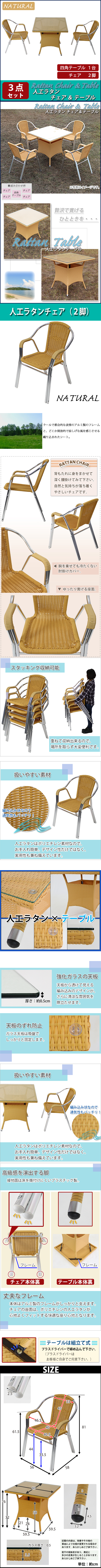 | 商品名 | 送料無料 ガーデンチェア ガーデン チェア ラタンチェア ラタン テーブル ラタンテーブル 人工ラタンチェア2脚 四角テーブル1台 3点セット 強化ガラス ナチュラル 籐 肘掛けカバー付 家具 ファニチャー インテリア スタッキングチェア リビング chair 椅子 南国 アジアン バリ風 リゾート ホテル ベランダ バルコニー 庭 rattan1765t3setna |