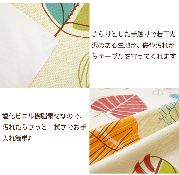 汚れを長時間放置すると染みになることがあります。 塩化ビニールの耐熱温度は約60℃です。直接熱い物を置くと、型が写ったり、歪む場合があります。 たたみじわが気になる場合は、テーブルクロスを広げてドライヤーの温冷を切り替えながら風を当てると、たたみジワがある程度目立たなくなります。(長時間温めすぎると、変形する可能性があるのでご注意下さい。) 高級家具、塩ビ系塗装、ニス系塗装、ラッカー塗装、海外品や天然塗りものなどに、塩ビ単体の商品を直接敷くと型がつくことがあります。置く場合は必ず布を間に敷いて下さい。 テーブルに塩化ビニールを長時間使用したままにすると、稀にベタベタとしてしまう場合があります。10日に1回程度は取り外して、テーブルと塩化ビニールの裏側を乾拭きして下さい。 新品時のビニール自体のニオイは、風通しの良い所で陰干しするとほとんど消えます。(このニオイは無害です。) | |