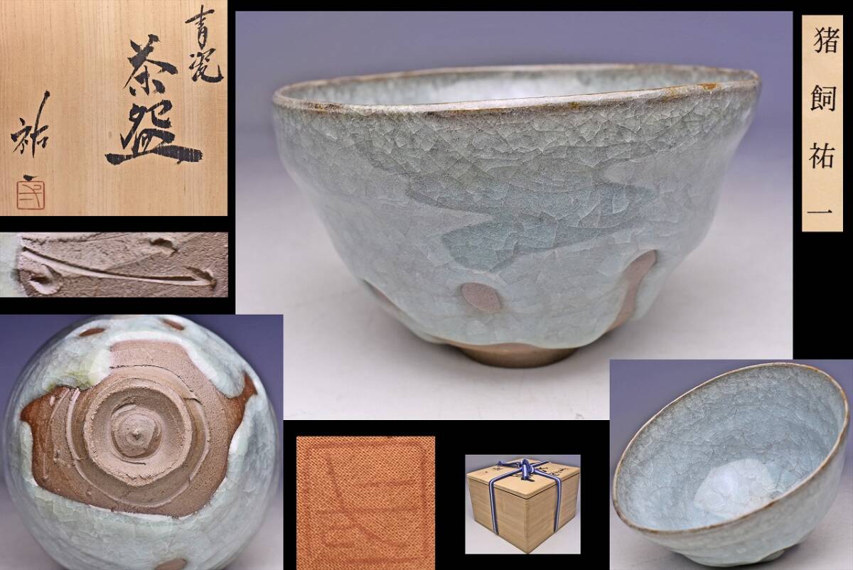 猪飼祐一 ★ 青磁 茶碗 ★ 共箱 ★ 師: 人間国宝 清水卯一 ★ 大振りで堂々とした造形に釉景見事な上作 ★ 茶道具 ★ 京都 ★